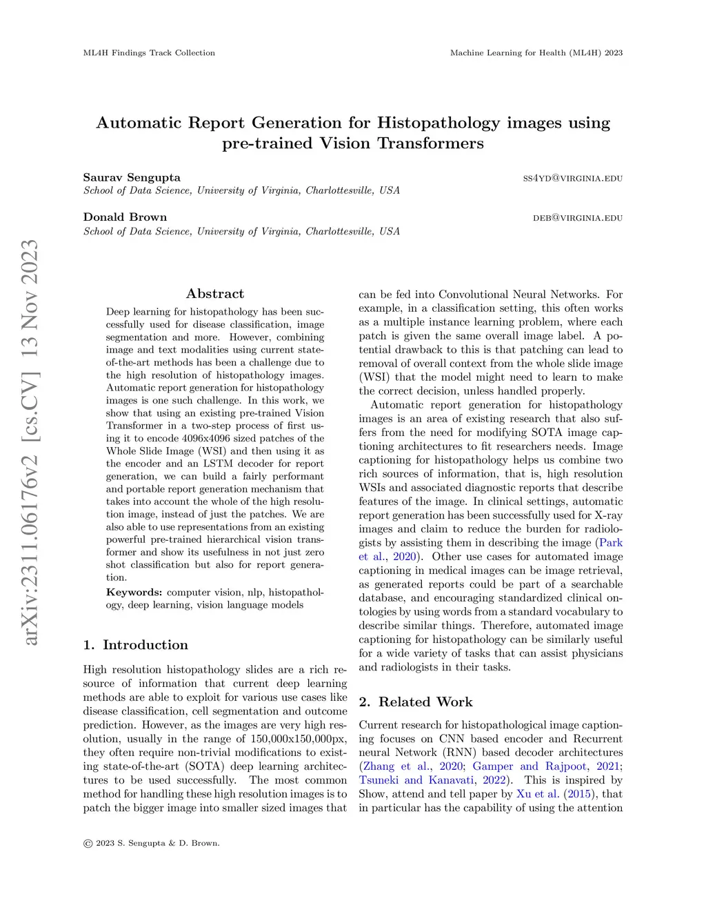 Deep learning for histopathology has been successfully used for disease classification, image segmentation and more. However, combining image and text modalities using current state-of-the-art methods has been a challenge due to the high resolution of histopathology images. Automatic report generation for histopathology images is one such challenge. In this work, we show that using an existing pre-trained Vision Transformer in a two-step process of first using it to encode 4096x4096 sized patches of the Whole Slide Image (WSI) and then using it as the encoder and an LSTM decoder for report generation, we can build a fairly performant and portable report generation mechanism that takes into account the whole of the high resolution image, instead of just the patches. We are also able to use representations from an existing powerful pre-trained hierarchical vision transformer and show its usefulness in not just zero shot classification but also for report generation.