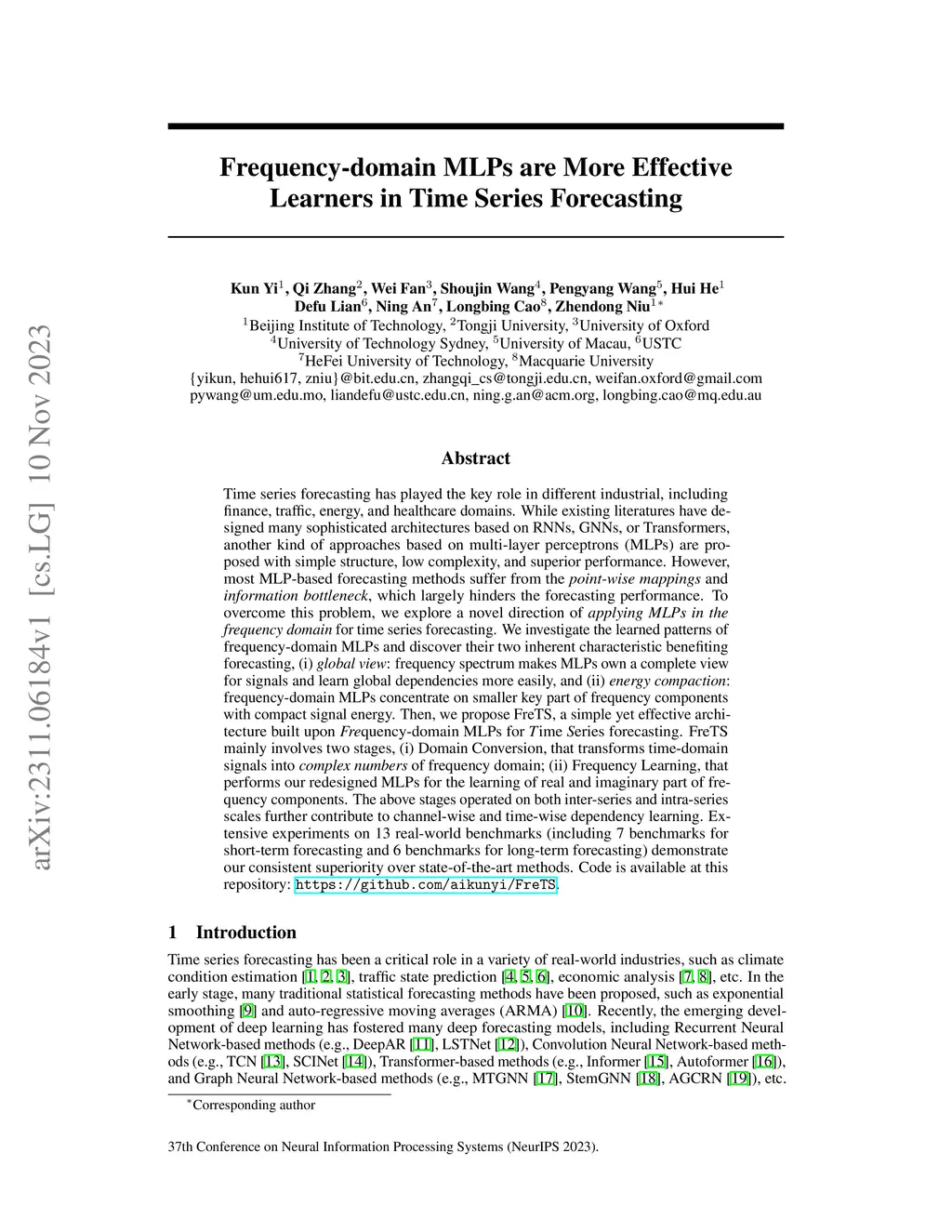Time series forecasting has played the key role in different industrial, including finance, traffic, energy, and healthcare domains. While existing literatures have designed many sophisticated architectures based on RNNs, GNNs, or Transformers, another kind of approaches based on multi-layer perceptrons (MLPs) are proposed with simple structure, low complexity, and {superior performance}. However, most MLP-based forecasting methods suffer from the point-wise mappings and information bottleneck, which largely hinders the forecasting performance. To overcome this problem, we explore a novel direction of applying MLPs in the frequency domain for time series forecasting. We investigate the learned patterns of frequency-domain MLPs and discover their two inherent characteristic benefiting forecasting, (i) global view: frequency spectrum makes MLPs own a complete view for signals and learn global dependencies more easily, and (ii) energy compaction: frequency-domain MLPs concentrate on smaller key part of frequency components with compact signal energy. Then, we propose FreTS, a simple yet effective architecture built upon Frequency-domain MLPs for Time Series forecasting. FreTS mainly involves two stages, (i) Domain Conversion, that transforms time-domain signals into complex numbers of frequency domain; (ii) Frequency Learning, that performs our redesigned MLPs for the learning of real and imaginary part of frequency components. The above stages operated on both inter-series and intra-series scales further contribute to channel-wise and time-wise dependency learning. Extensive experiments on 13 real-world benchmarks (including 7 benchmarks for short-term forecasting and 6 benchmarks for long-term forecasting) demonstrate our consistent superiority over state-of-the-art methods.