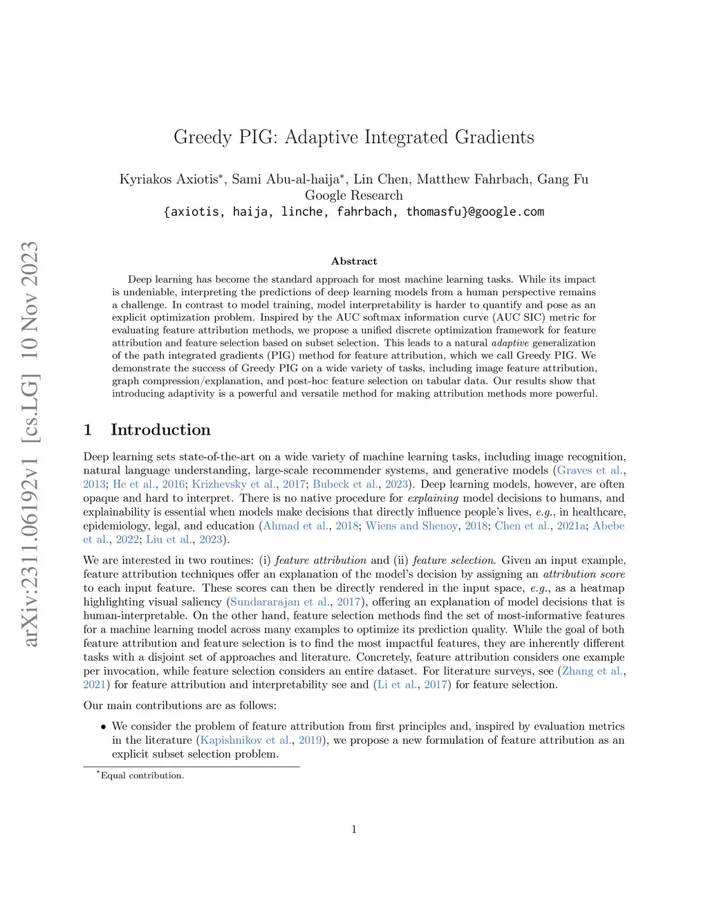 Deep learning has become the standard approach for most machine learning tasks. While its impact is undeniable, interpreting the predictions of deep learning models from a human perspective remains a challenge. In contrast to model training, model interpretability is harder to quantify and pose as an explicit optimization problem. Inspired by the AUC softmax information curve (AUC SIC) metric for evaluating feature attribution methods, we propose a unified discrete optimization framework for feature attribution and feature selection based on subset selection. This leads to a natural adaptive generalization of the path integrated gradients (PIG) method for feature attribution, which we call Greedy PIG. We demonstrate the success of Greedy PIG on a wide variety of tasks, including image feature attribution, graph compression/explanation, and post-hoc feature selection on tabular data. Our results show that introducing adaptivity is a powerful and versatile method for making attribution methods more powerful.