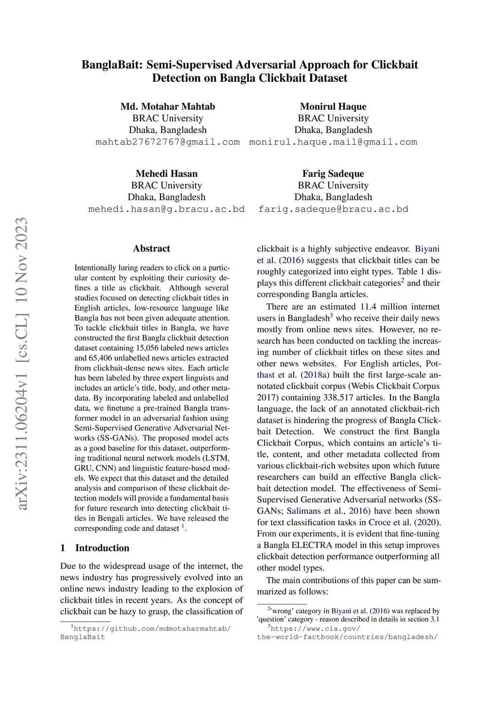 BanglaBait: Semi-Supervised Adversarial Approach for Clickbait Detection