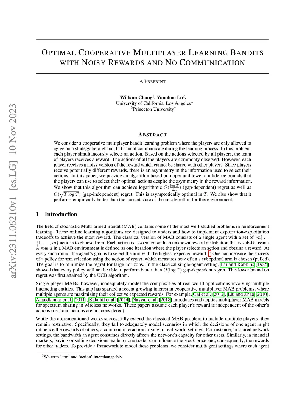 We consider a cooperative multiplayer bandit learning problem where the players are only allowed to agree on a strategy beforehand, but cannot communicate during the learning process. In this problem, each player simultaneously selects an action. Based on the actions selected by all players, the team of players receives a reward. The actions of all the players are commonly observed. However, each player receives a noisy version of the reward which cannot be shared with other players. Since players receive potentially different rewards, there is an asymmetry in the information used to select their actions. In this paper, we provide an algorithm based on upper and lower confidence bounds that the players can use to select their optimal actions despite the asymmetry in the reward information. We show that this algorithm can achieve logarithmic (gap-dependent) regret as well as (gap-independent) regret. This is asymptotically optimal in . We also show that it performs empirically better than the current state of the art algorithm for this environment.