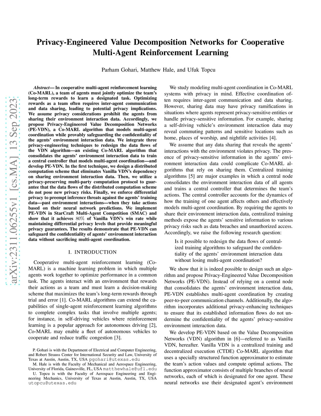 In cooperative multi-agent reinforcement learning (Co-MARL), a team of agents must jointly optimize the team's long-term rewards to learn a designated task. Optimizing rewards as a team often requires inter-agent communication and data sharing, leading to potential privacy implications. We assume privacy considerations prohibit the agents from sharing their environment interaction data. Accordingly, we propose Privacy-Engineered Value Decomposition Networks (PE-VDN), a Co-MARL algorithm that models multi-agent coordination while provably safeguarding the confidentiality of the agents' environment interaction data. We integrate three privacy-engineering techniques to redesign the data flows of the VDN algorithm, an existing Co-MARL algorithm that consolidates the agents' environment interaction data to train a central controller that models multi-agent coordination, and develop PE-VDN. In the first technique, we design a distributed computation scheme that eliminates Vanilla VDN's dependency on sharing environment interaction data. Then, we utilize a privacy-preserving multi-party computation protocol to guarantee that the data flows of the distributed computation scheme do not pose new privacy risks. Finally, we enforce differential privacy to preempt inference threats against the agents' training data, past environment interactions, when they take actions based on their neural network predictions. We implement PE-VDN in StarCraft Multi-Agent Competition (SMAC) and show that it achieves 80% of Vanilla VDN's win rate while maintaining differential privacy levels that provide meaningful privacy guarantees. The results demonstrate that PE-VDN can safeguard the confidentiality of agents' environment interaction data without sacrificing multi-agent coordination.