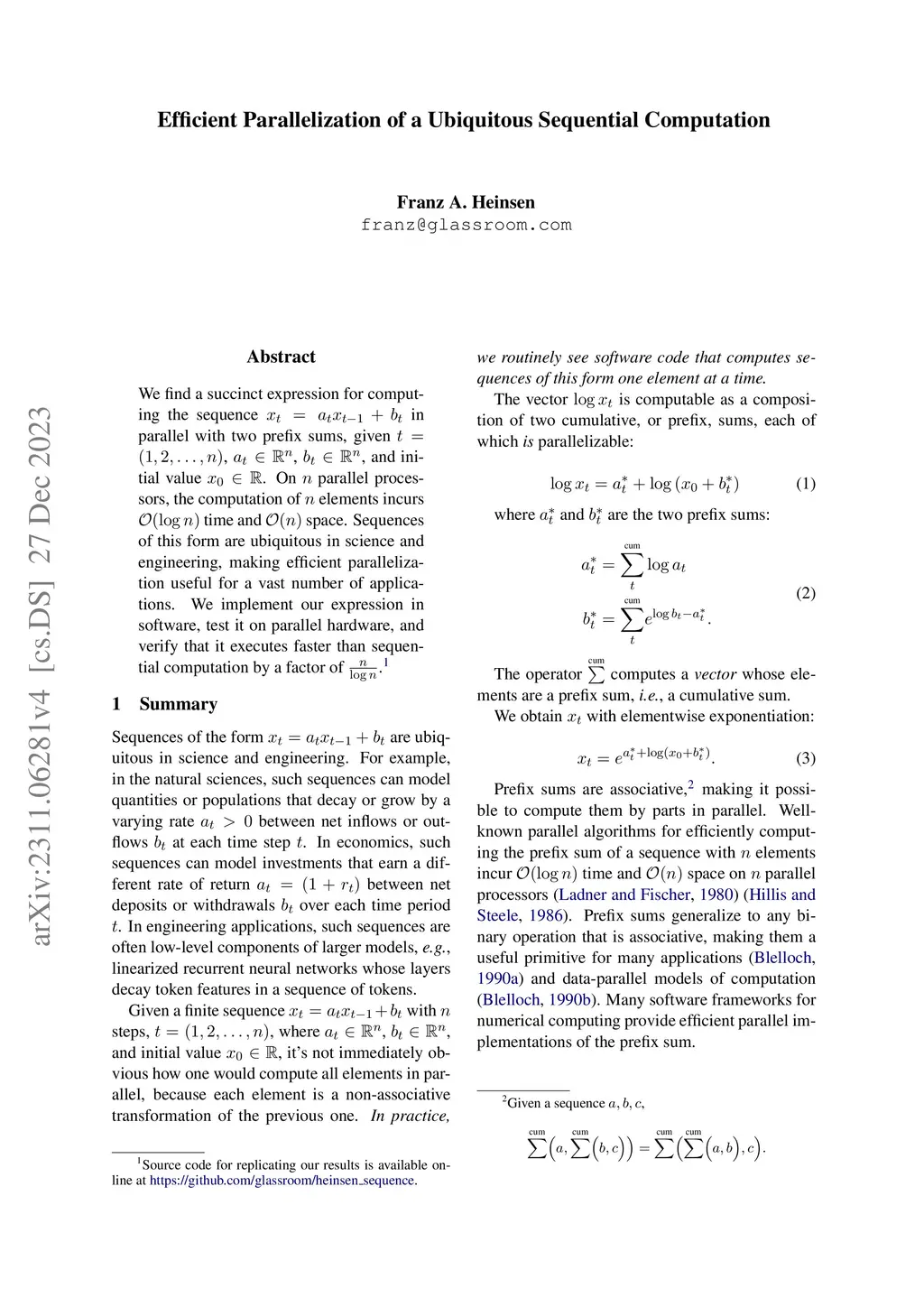 We find a succinct expression for computing the sequence in parallel with two prefix sums, given , , , and initial value . On parallel processors, the computation of elements incurs time and space. Sequences of this form are ubiquitous in science and engineering, making efficient parallelization useful for a vast number of applications. We implement our expression in software, test it on parallel hardware, and verify that it executes faster than sequential computation by a factor of .