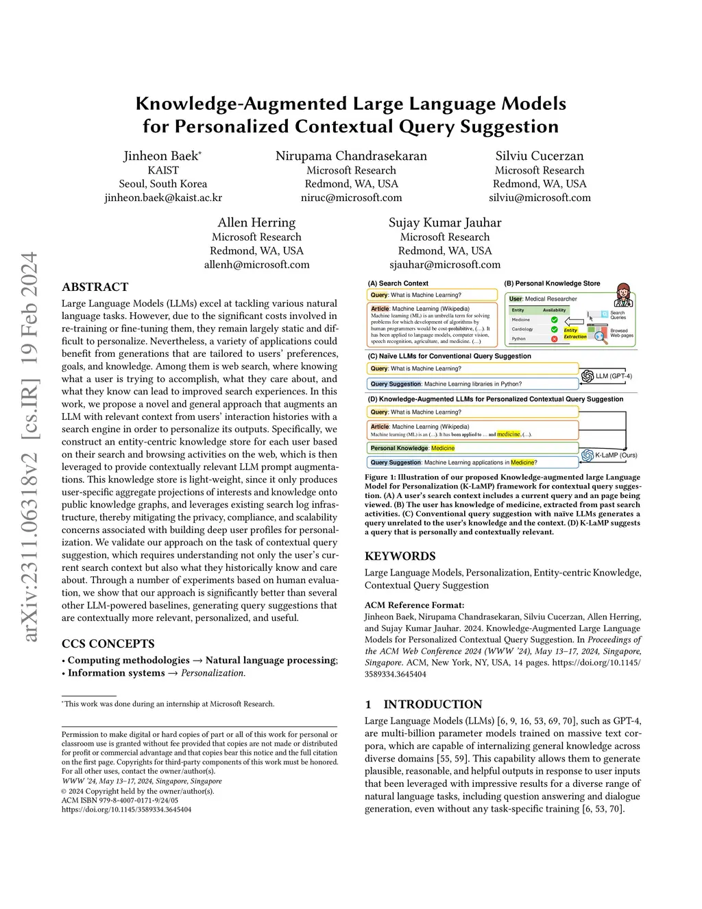 Large Language Models (LLMs) excel at tackling various natural language tasks. However, due to the significant costs involved in re-training or fine-tuning them, they remain largely static and difficult to personalize. Nevertheless, a variety of applications could benefit from generations that are tailored to users' preferences, goals, and knowledge. Among them is web search, where knowing what a user is trying to accomplish, what they care about, and what they know can lead to improved search experiences. In this work, we propose a novel and general approach that augments an LLM with relevant context from users' interaction histories with a search engine in order to personalize its outputs. Specifically, we construct an entity-centric knowledge store for each user based on their search and browsing activities on the web, which is then leveraged to provide contextually relevant LLM prompt augmentations. This knowledge store is light-weight, since it only produces user-specific aggregate projections of interests and knowledge onto public knowledge graphs, and leverages existing search log infrastructure, thereby mitigating the privacy, compliance, and scalability concerns associated with building deep user profiles for personalization. We validate our approach on the task of contextual query suggestion, which requires understanding not only the user's current search context but also what they historically know and care about. Through a number of experiments based on human evaluation, we show that our approach is significantly better than several other LLM-powered baselines, generating query suggestions that are contextually more relevant, personalized, and useful.