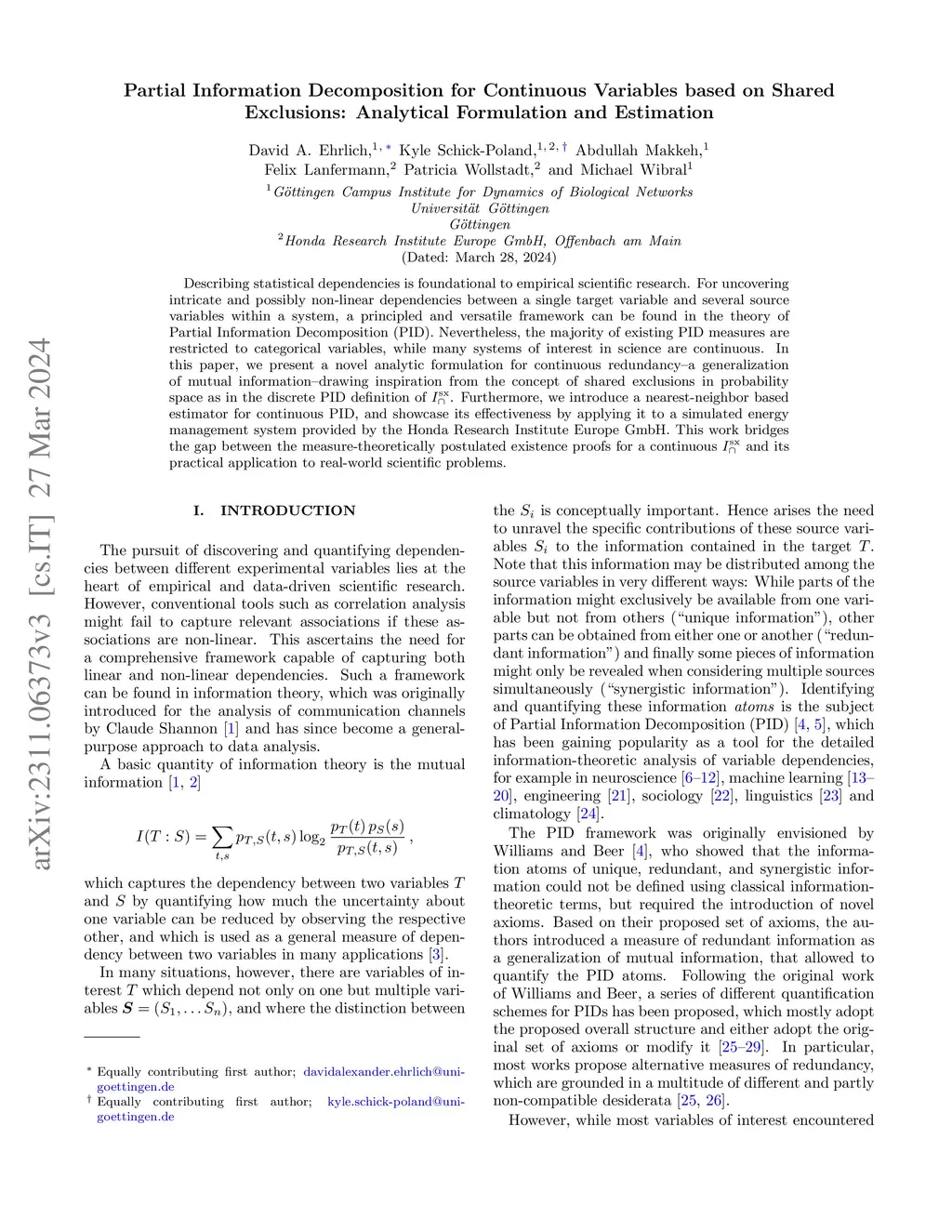 Describing statistical dependencies is foundational to empirical scientific research. For uncovering intricate and possibly non-linear dependencies between a single target variable and several source variables within a system, a principled and versatile framework can be found in the theory of Partial Information Decomposition (PID). Nevertheless, the majority of existing PID measures are restricted to categorical variables, while many systems of interest in science are continuous. In this paper, we present a novel analytic formulation for continuous redundancy--a generalization of mutual information--drawing inspiration from the concept of shared exclusions in probability space as in the discrete PID definition of . Furthermore, we introduce a nearest-neighbor based estimator for continuous PID, and showcase its effectiveness by applying it to a simulated energy management system provided by the Honda Research Institute Europe GmbH. This work bridges the gap between the measure-theoretically postulated existence proofs for a continuous and its practical application to real-world scientific problems.