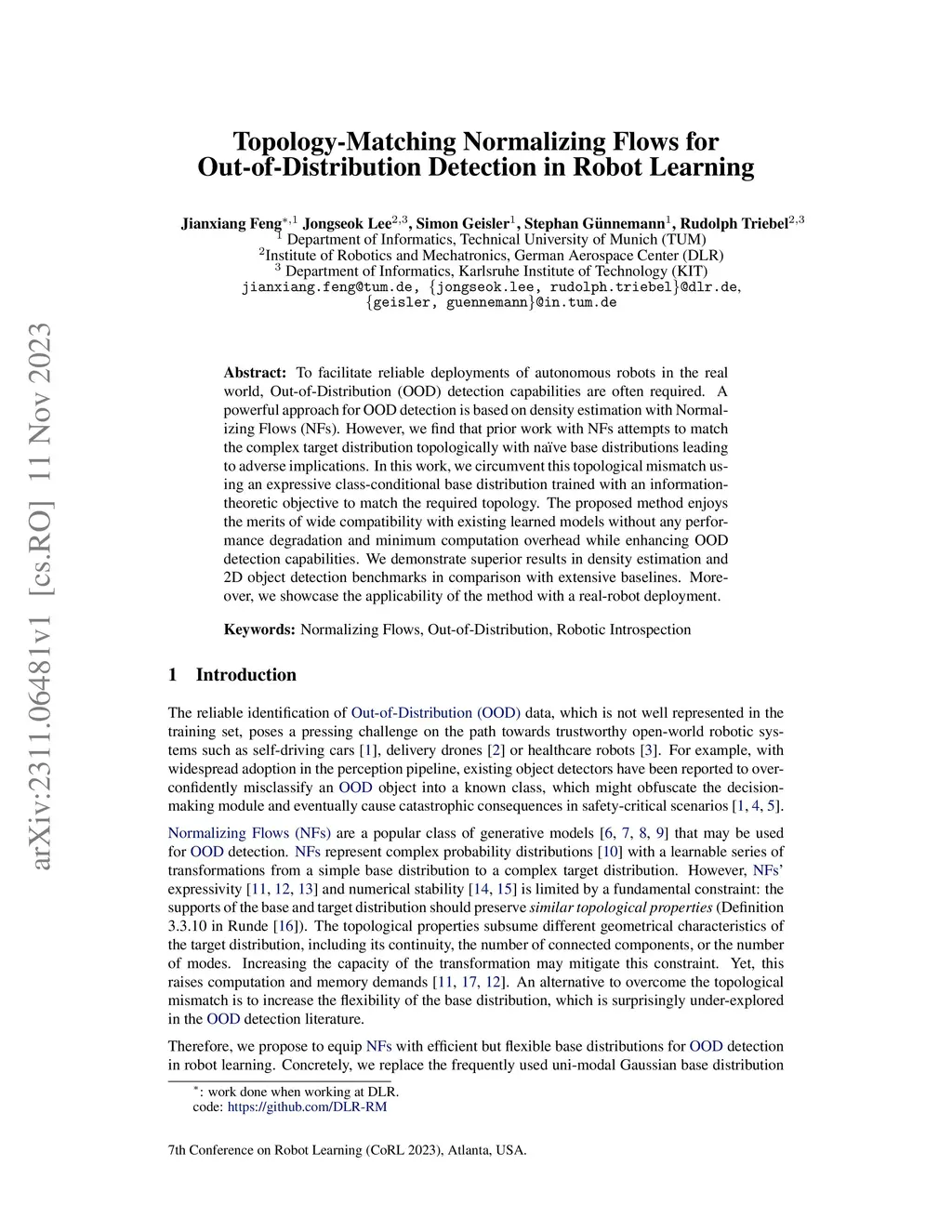 To facilitate reliable deployments of autonomous robots in the real world, Out-of-Distribution (OOD) detection capabilities are often required. A powerful approach for OOD detection is based on density estimation with Normalizing Flows (NFs). However, we find that prior work with NFs attempts to match the complex target distribution topologically with naive base distributions leading to adverse implications. In this work, we circumvent this topological mismatch using an expressive class-conditional base distribution trained with an information-theoretic objective to match the required topology. The proposed method enjoys the merits of wide compatibility with existing learned models without any performance degradation and minimum computation overhead while enhancing OOD detection capabilities. We demonstrate superior results in density estimation and 2D object detection benchmarks in comparison with extensive baselines. Moreover, we showcase the applicability of the method with a real-robot deployment.