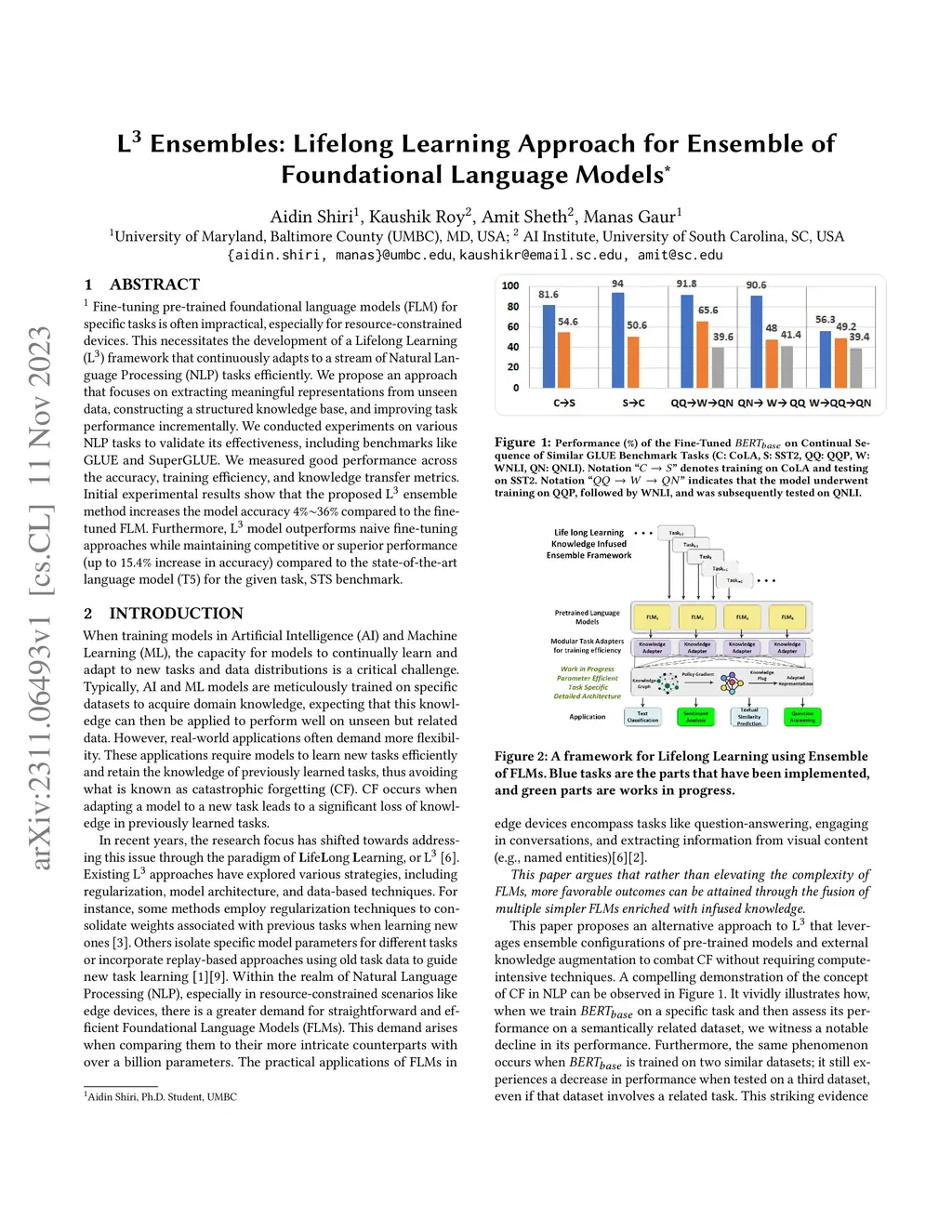 Fine-tuning pre-trained foundational language models (FLM) for specific tasks is often impractical, especially for resource-constrained devices. This necessitates the development of a Lifelong Learning (L3) framework that continuously adapts to a stream of Natural Language Processing (NLP) tasks efficiently. We propose an approach that focuses on extracting meaningful representations from unseen data, constructing a structured knowledge base, and improving task performance incrementally. We conducted experiments on various NLP tasks to validate its effectiveness, including benchmarks like GLUE and SuperGLUE. We measured good performance across the accuracy, training efficiency, and knowledge transfer metrics. Initial experimental results show that the proposed L3 ensemble method increases the model accuracy by 4% ~ 36% compared to the fine-tuned FLM. Furthermore, L3 model outperforms naive fine-tuning approaches while maintaining competitive or superior performance (up to 15.4% increase in accuracy) compared to the state-of-the-art language model (T5) for the given task, STS benchmark.