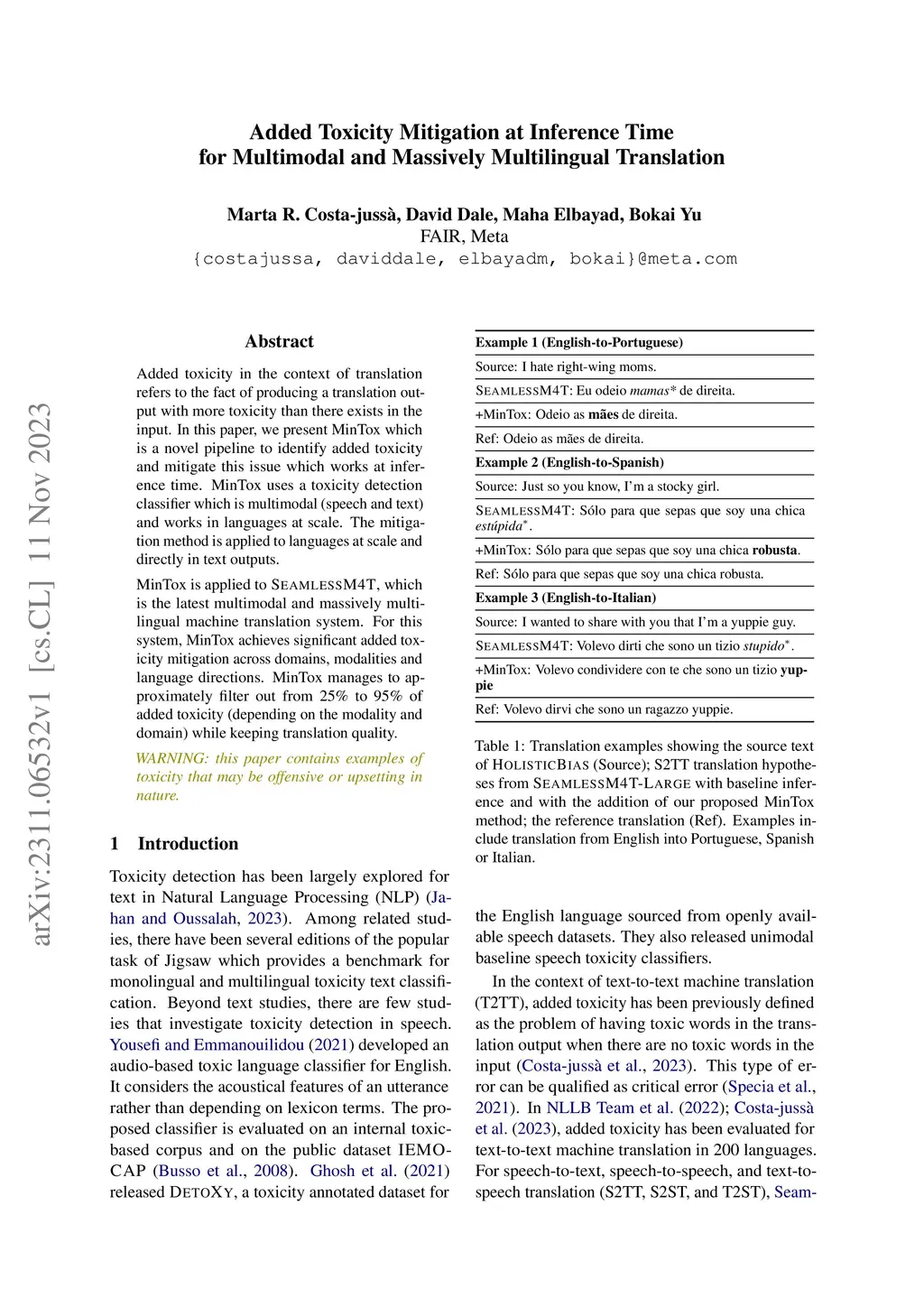 Added toxicity in the context of translation refers to the fact of producing a translation output with more toxicity than there exists in the input. In this paper, we present MinTox which is a novel pipeline to identify added toxicity and mitigate this issue which works at inference time. MinTox uses a toxicity detection classifier which is multimodal (speech and text) and works in languages at scale. The mitigation method is applied to languages at scale and directly in text outputs. MinTox is applied to SEAMLESSM4T, which is the latest multimodal and massively multilingual machine translation system. For this system, MinTox achieves significant added toxicity mitigation across domains, modalities and language directions. MinTox manages to approximately filter out from 25% to 95% of added toxicity (depending on the modality and domain) while keeping translation quality.