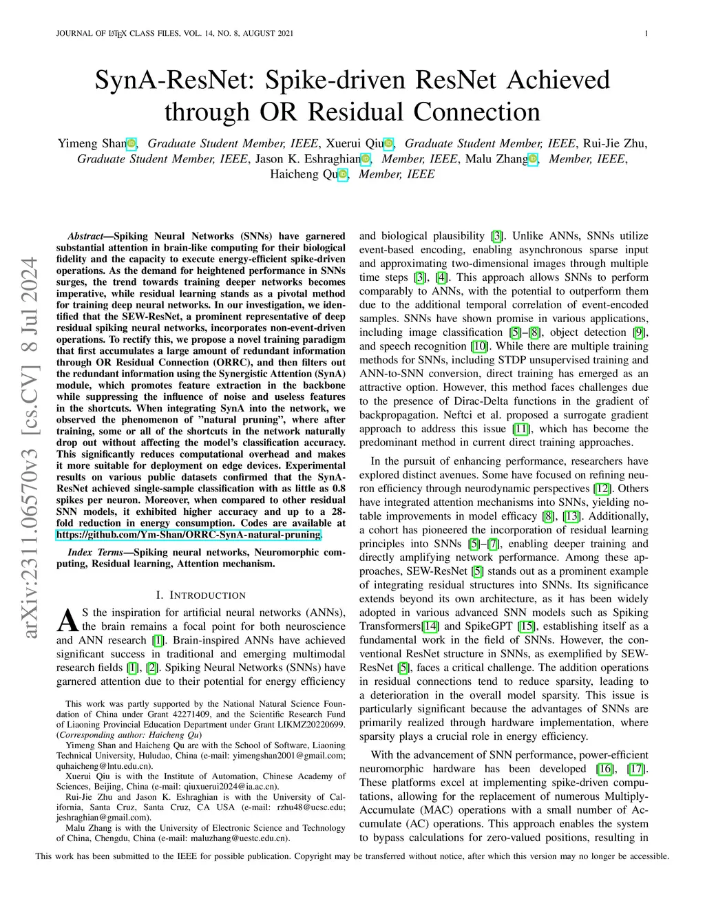 Spiking Neural Networks (SNNs) have garnered substantial attention in brain-like computing for their biological fidelity and the capacity to execute energy-efficient spike-driven operations. As the demand for heightened performance in SNNs surges, the trend towards training deeper networks becomes imperative, while residual learning stands as a pivotal method for training deep neural networks. In our investigation, we identified that the SEW-ResNet, a prominent representative of deep residual spiking neural networks, incorporates non-event-driven operations. To rectify this, we propose a novel training paradigm that first accumulates a large amount of redundant information through OR Residual Connection (ORRC), and then filters out the redundant information using the Synergistic Attention (SynA) module, which promotes feature extraction in the backbone while suppressing the influence of noise and useless features in the shortcuts. When integrating SynA into the network, we observed the phenomenon of "natural pruning", where after training, some or all of the shortcuts in the network naturally drop out without affecting the model's classification accuracy. This significantly reduces computational overhead and makes it more suitable for deployment on edge devices. Experimental results on various public datasets confirmed that the SynA-ResNet achieved single-sample classification with as little as 0.8 spikes per neuron. Moreover, when compared to other residual SNN models, it exhibited higher accuracy and up to a 28-fold reduction in energy consumption.