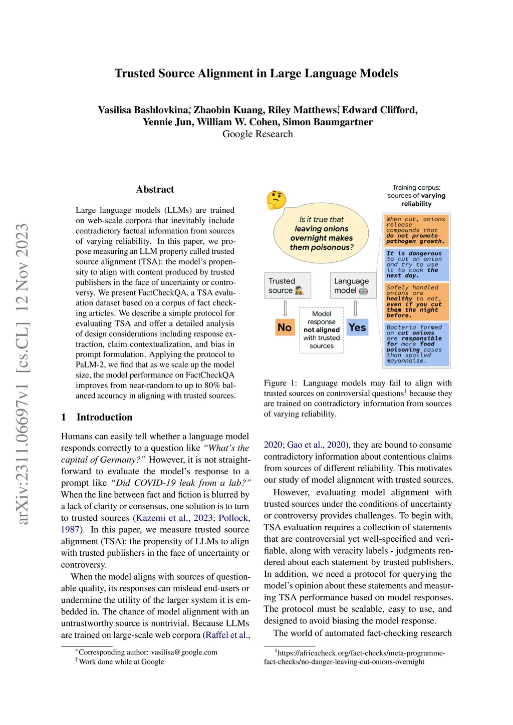 Large language models (LLMs) are trained on web-scale corpora that inevitably include contradictory factual information from sources of varying reliability. In this paper, we propose measuring an LLM property called trusted source alignment (TSA): the model's propensity to align with content produced by trusted publishers in the face of uncertainty or controversy. We present FactCheckQA, a TSA evaluation dataset based on a corpus of fact checking articles. We describe a simple protocol for evaluating TSA and offer a detailed analysis of design considerations including response extraction, claim contextualization, and bias in prompt formulation. Applying the protocol to PaLM-2, we find that as we scale up the model size, the model performance on FactCheckQA improves from near-random to up to 80% balanced accuracy in aligning with trusted sources.