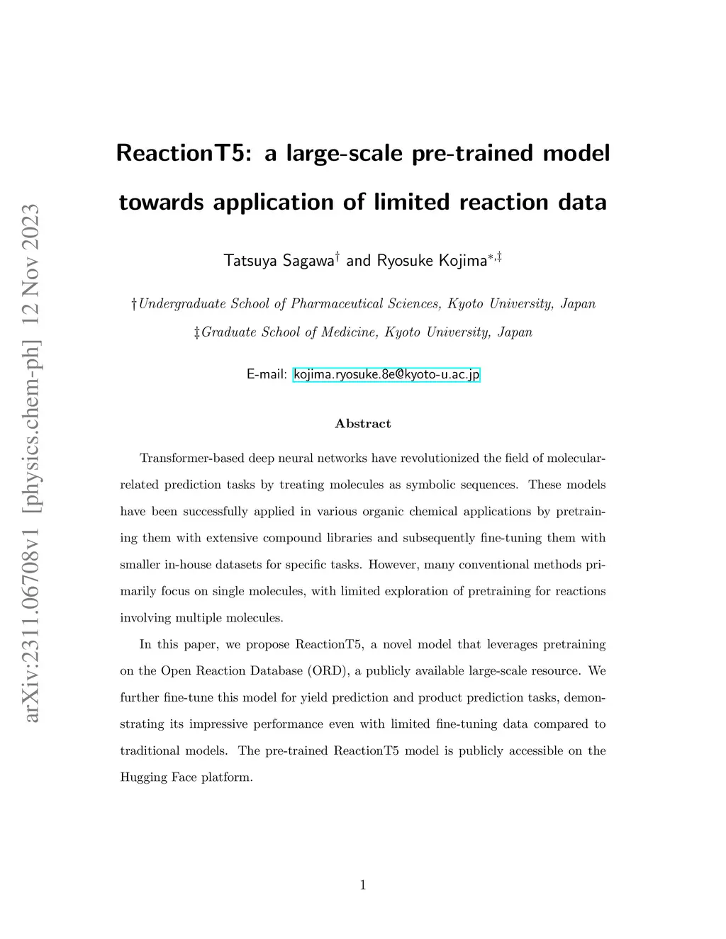 Transformer-based deep neural networks have revolutionized the field of molecular-related prediction tasks by treating molecules as symbolic sequences. These models have been successfully applied in various organic chemical applications by pretraining them with extensive compound libraries and subsequently fine-tuning them with smaller in-house datasets for specific tasks. However, many conventional methods primarily focus on single molecules, with limited exploration of pretraining for reactions involving multiple molecules. In this paper, we propose ReactionT5, a novel model that leverages pretraining on the Open Reaction Database (ORD), a publicly available large-scale resource. We further fine-tune this model for yield prediction and product prediction tasks, demonstrating its impressive performance even with limited fine-tuning data compared to traditional models. The pre-trained ReactionT5 model is publicly accessible on the Hugging Face platform.