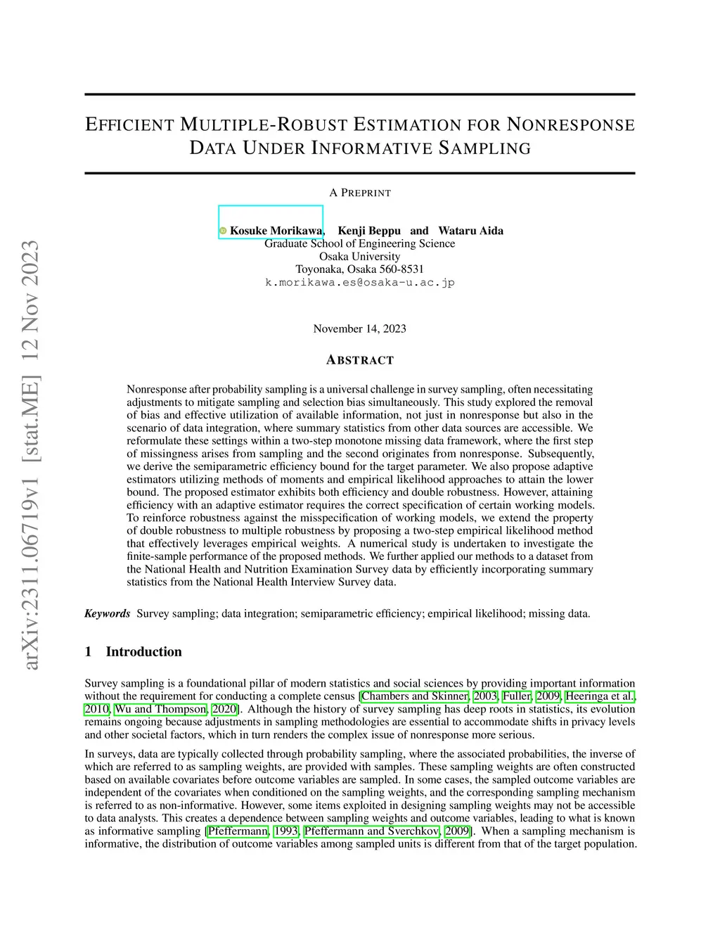Nonresponse after probability sampling is a universal challenge in survey sampling, often necessitating adjustments to mitigate sampling and selection bias simultaneously. This study explored the removal of bias and effective utilization of available information, not just in nonresponse but also in the scenario of data integration, where summary statistics from other data sources are accessible. We reformulate these settings within a two-step monotone missing data framework, where the first step of missingness arises from sampling and the second originates from nonresponse. Subsequently, we derive the semiparametric efficiency bound for the target parameter. We also propose adaptive estimators utilizing methods of moments and empirical likelihood approaches to attain the lower bound. The proposed estimator exhibits both efficiency and double robustness. However, attaining efficiency with an adaptive estimator requires the correct specification of certain working models. To reinforce robustness against the misspecification of working models, we extend the property of double robustness to multiple robustness by proposing a two-step empirical likelihood method that effectively leverages empirical weights. A numerical study is undertaken to investigate the finite-sample performance of the proposed methods. We further applied our methods to a dataset from the National Health and Nutrition Examination Survey data by efficiently incorporating summary statistics from the National Health Interview Survey data.