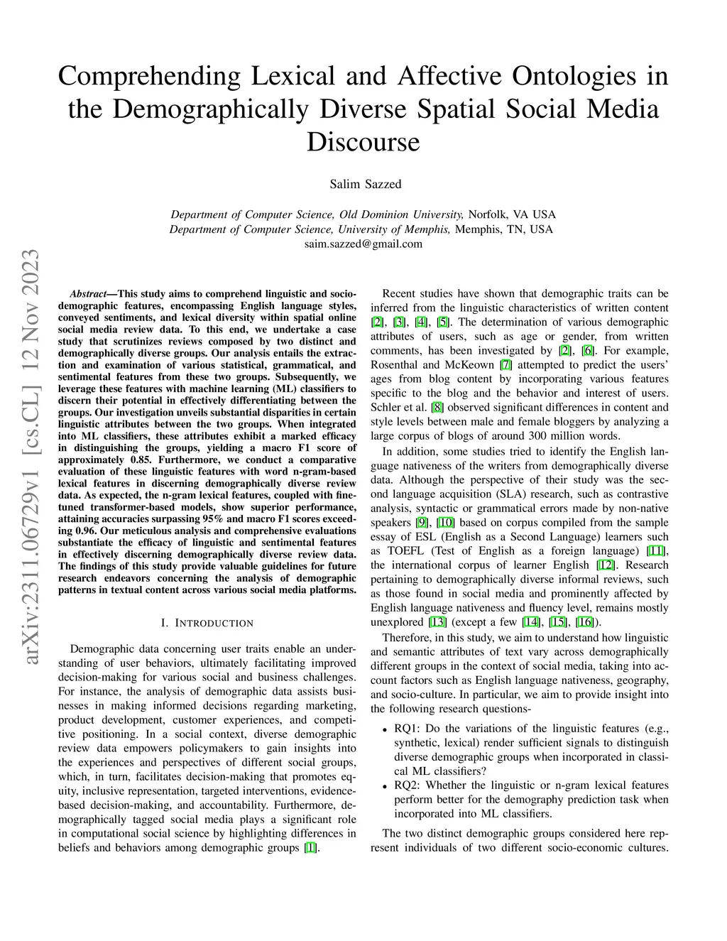 This study aims to comprehend linguistic and socio-demographic features, encompassing English language styles, conveyed sentiments, and lexical diversity within spatial online social media review data. To this end, we undertake a case study that scrutinizes reviews composed by two distinct and demographically diverse groups. Our analysis entails the extraction and examination of various statistical, grammatical, and sentimental features from these two groups. Subsequently, we leverage these features with machine learning (ML) classifiers to discern their potential in effectively differentiating between the groups. Our investigation unveils substantial disparities in certain linguistic attributes between the two groups. When integrated into ML classifiers, these attributes exhibit a marked efficacy in distinguishing the groups, yielding a macro F1 score of approximately 0.85. Furthermore, we conduct a comparative evaluation of these linguistic features with word n-gram-based lexical features in discerning demographically diverse review data. As expected, the n-gram lexical features, coupled with fine-tuned transformer-based models, show superior performance, attaining accuracies surpassing 95\% and macro F1 scores exceeding 0.96. Our meticulous analysis and comprehensive evaluations substantiate the efficacy of linguistic and sentimental features in effectively discerning demographically diverse review data. The findings of this study provide valuable guidelines for future research endeavors concerning the analysis of demographic patterns in textual content across various social media platforms.