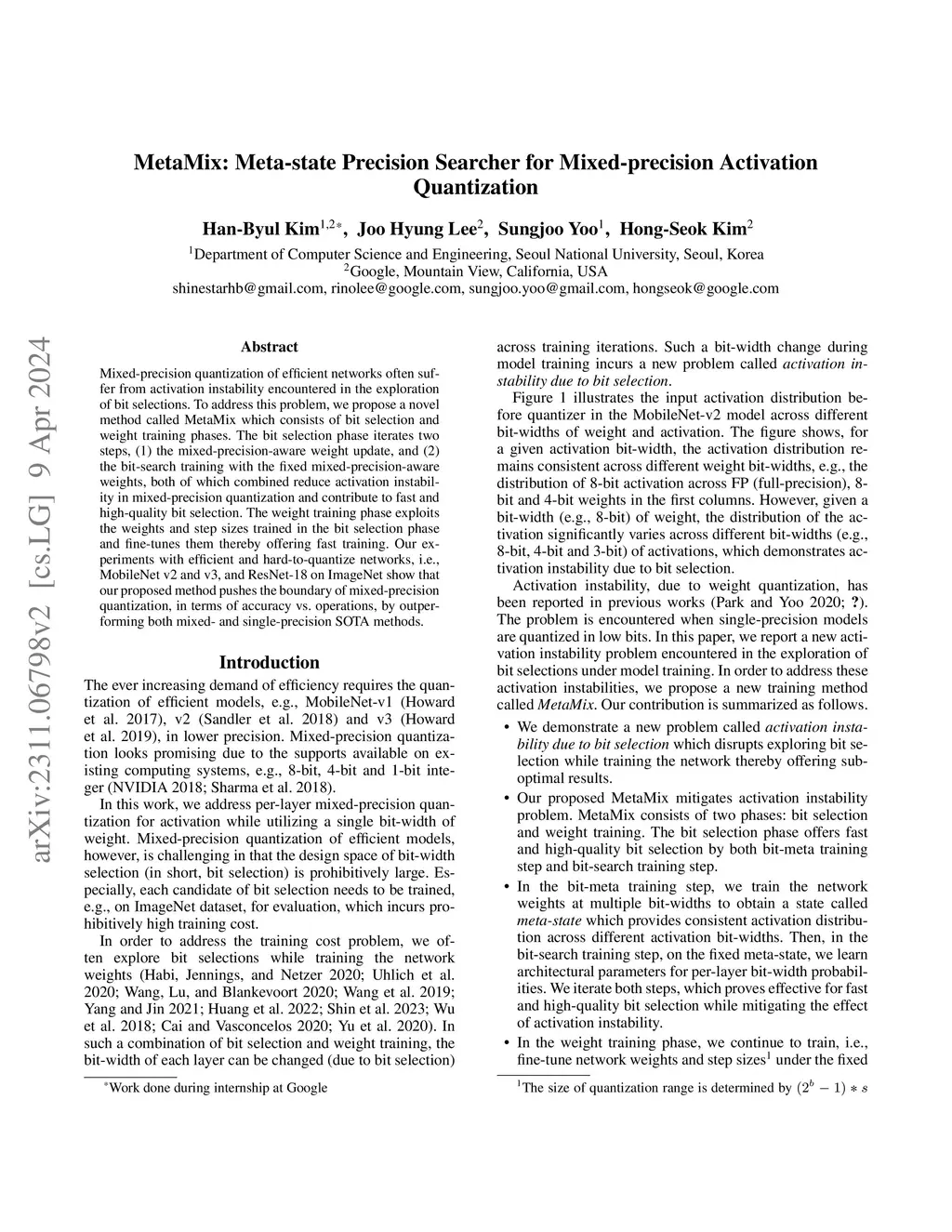 Mixed-precision quantization of efficient networks often suffer from activation instability encountered in the exploration of bit selections. To address this problem, we propose a novel method called MetaMix which consists of bit selection and weight training phases. The bit selection phase iterates two steps, (1) the mixed-precision-aware weight update, and (2) the bit-search training with the fixed mixed-precision-aware weights, both of which combined reduce activation instability in mixed-precision quantization and contribute to fast and high-quality bit selection. The weight training phase exploits the weights and step sizes trained in the bit selection phase and fine-tunes them thereby offering fast training. Our experiments with efficient and hard-to-quantize networks, i.e., MobileNet v2 and v3, and ResNet-18 on ImageNet show that our proposed method pushes the boundary of mixed-precision quantization, in terms of accuracy vs. operations, by outperforming both mixed- and single-precision SOTA methods.