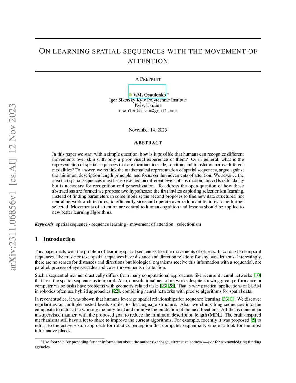 In this paper we start with a simple question, how is it possible that humans can recognize different movements over skin with only a prior visual experience of them? Or in general, what is the representation of spatial sequences that are invariant to scale, rotation, and translation across different modalities? To answer, we rethink the mathematical representation of spatial sequences, argue against the minimum description length principle, and focus on the movements of attention. We advance the idea that spatial sequences must be represented on different levels of abstraction, this adds redundancy but is necessary for recognition and generalization. To address the open question of how these abstractions are formed we propose two hypotheses: the first invites exploring selectionism learning, instead of finding parameters in some models; the second proposes to find new data structures, not neural network architectures, to efficiently store and operate over redundant features to be further selected. Movements of attention are central to human cognition and lessons should be applied to new better learning algorithms.