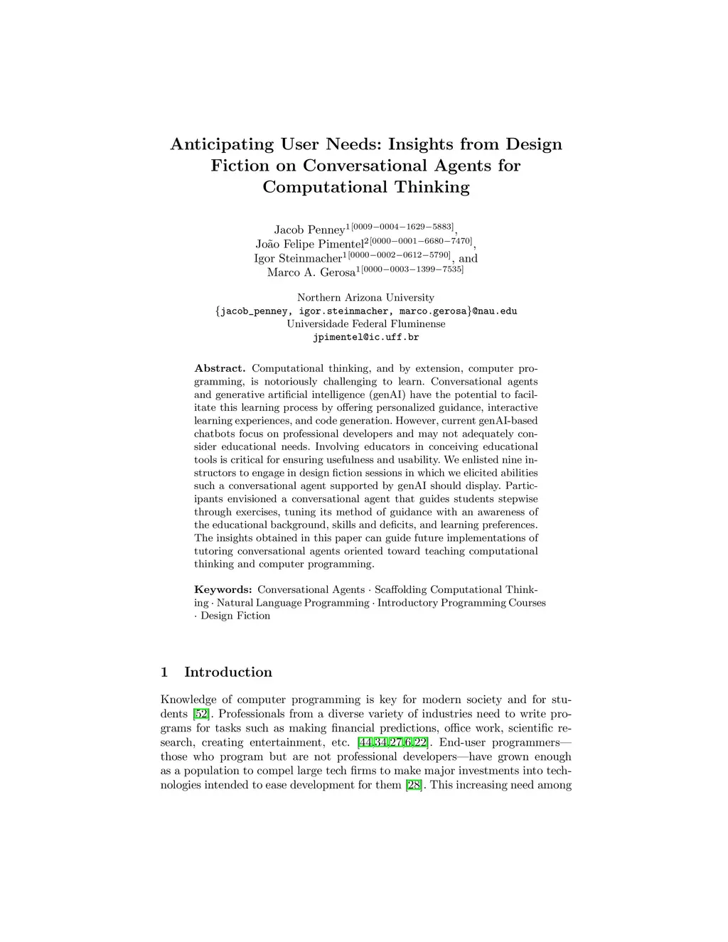 Computational thinking, and by extension, computer programming, is notoriously challenging to learn. Conversational agents and generative artificial intelligence (genAI) have the potential to facilitate this learning process by offering personalized guidance, interactive learning experiences, and code generation. However, current genAI-based chatbots focus on professional developers and may not adequately consider educational needs. Involving educators in conceiving educational tools is critical for ensuring usefulness and usability. We enlisted nine instructors to engage in design fiction sessions in which we elicited abilities such a conversational agent supported by genAI should display. Participants envisioned a conversational agent that guides students stepwise through exercises, tuning its method of guidance with an awareness of the educational background, skills and deficits, and learning preferences. The insights obtained in this paper can guide future implementations of tutoring conversational agents oriented toward teaching computational thinking and computer programming.