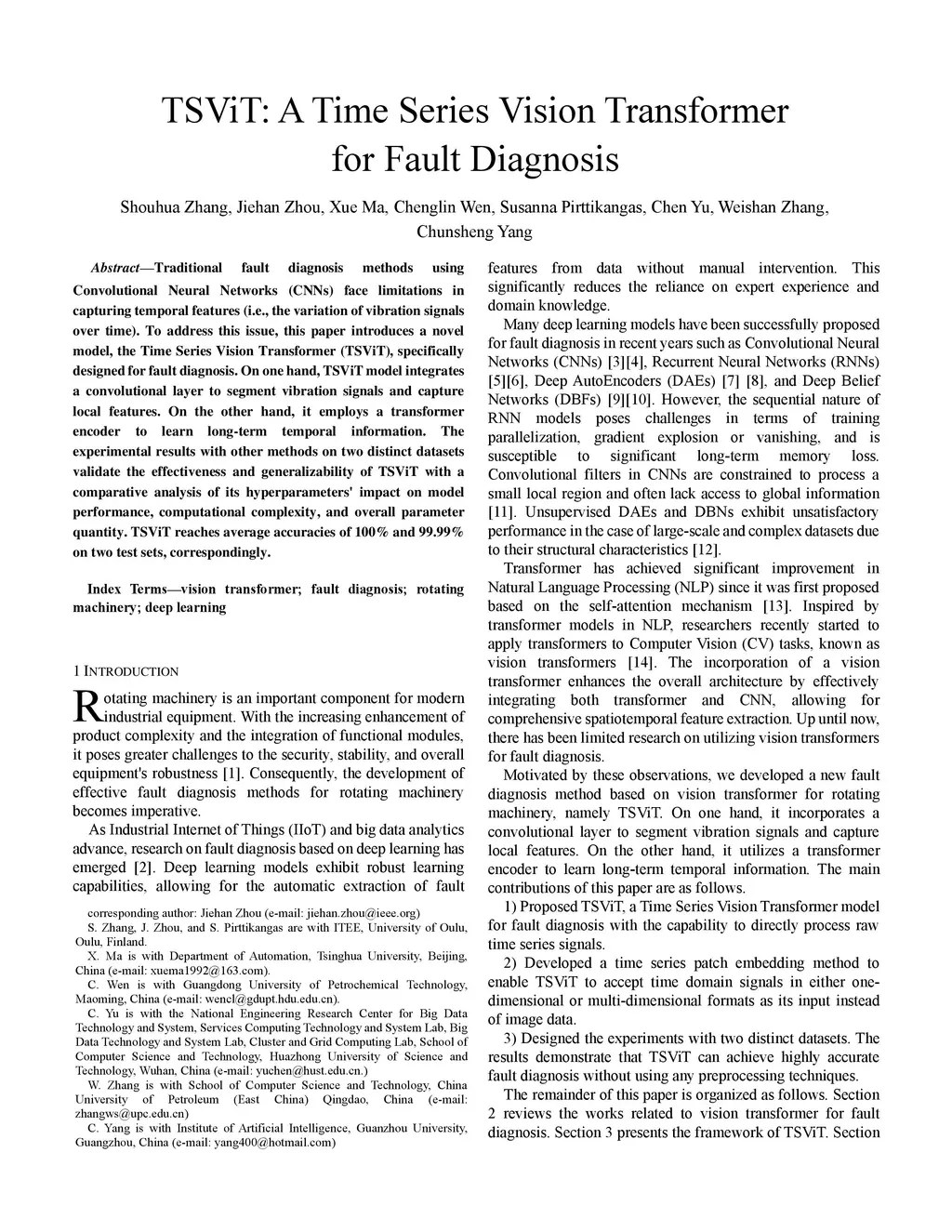 Traditional fault diagnosis methods using Convolutional Neural Networks (CNNs) face limitations in capturing temporal features (i.e., the variation of vibration signals over time). To address this issue, this paper introduces a novel model, the Time Series Vision Transformer (TSViT), specifically designed for fault diagnosis. On one hand, TSViT model integrates a convolutional layer to segment vibration signals and capture local features. On the other hand, it employs a transformer encoder to learn long-term temporal information. The experimental results with other methods on two distinct datasets validate the effectiveness and generalizability of TSViT with a comparative analysis of its hyperparameters' impact on model performance, computational complexity, and overall parameter quantity. TSViT reaches average accuracies of 100% and 99.99% on two test sets, correspondingly.