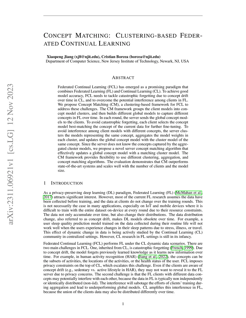 Federated Continual Learning (FCL) has emerged as a promising paradigm that combines Federated Learning (FL) and Continual Learning (CL). To achieve good model accuracy, FCL needs to tackle catastrophic forgetting due to concept drift over time in CL, and to overcome the potential interference among clients in FL. We propose Concept Matching (CM), a clustering-based framework for FCL to address these challenges. The CM framework groups the client models into concept model clusters, and then builds different global models to capture different concepts in FL over time. In each round, the server sends the global concept models to the clients. To avoid catastrophic forgetting, each client selects the concept model best-matching the concept of the current data for further fine-tuning. To avoid interference among client models with different concepts, the server clusters the models representing the same concept, aggregates the model weights in each cluster, and updates the global concept model with the cluster model of the same concept. Since the server does not know the concepts captured by the aggregated cluster models, we propose a novel server concept matching algorithm that effectively updates a global concept model with a matching cluster model. The CM framework provides flexibility to use different clustering, aggregation, and concept matching algorithms. The evaluation demonstrates that CM outperforms state-of-the-art systems and scales well with the number of clients and the model size.