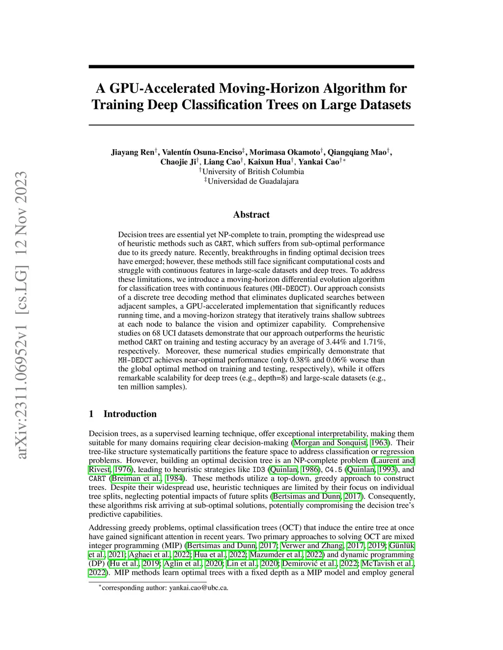 Decision trees are essential yet NP-complete to train, prompting the widespread use of heuristic methods such as CART, which suffers from sub-optimal performance due to its greedy nature. Recently, breakthroughs in finding optimal decision trees have emerged; however, these methods still face significant computational costs and struggle with continuous features in large-scale datasets and deep trees. To address these limitations, we introduce a moving-horizon differential evolution algorithm for classification trees with continuous features (MH-DEOCT). Our approach consists of a discrete tree decoding method that eliminates duplicated searches between adjacent samples, a GPU-accelerated implementation that significantly reduces running time, and a moving-horizon strategy that iteratively trains shallow subtrees at each node to balance the vision and optimizer capability. Comprehensive studies on 68 UCI datasets demonstrate that our approach outperforms the heuristic method CART on training and testing accuracy by an average of 3.44% and 1.71%, respectively. Moreover, these numerical studies empirically demonstrate that MH-DEOCT achieves near-optimal performance (only 0.38% and 0.06% worse than the global optimal method on training and testing, respectively), while it offers remarkable scalability for deep trees (e.g., depth=8) and large-scale datasets (e.g., ten million samples).