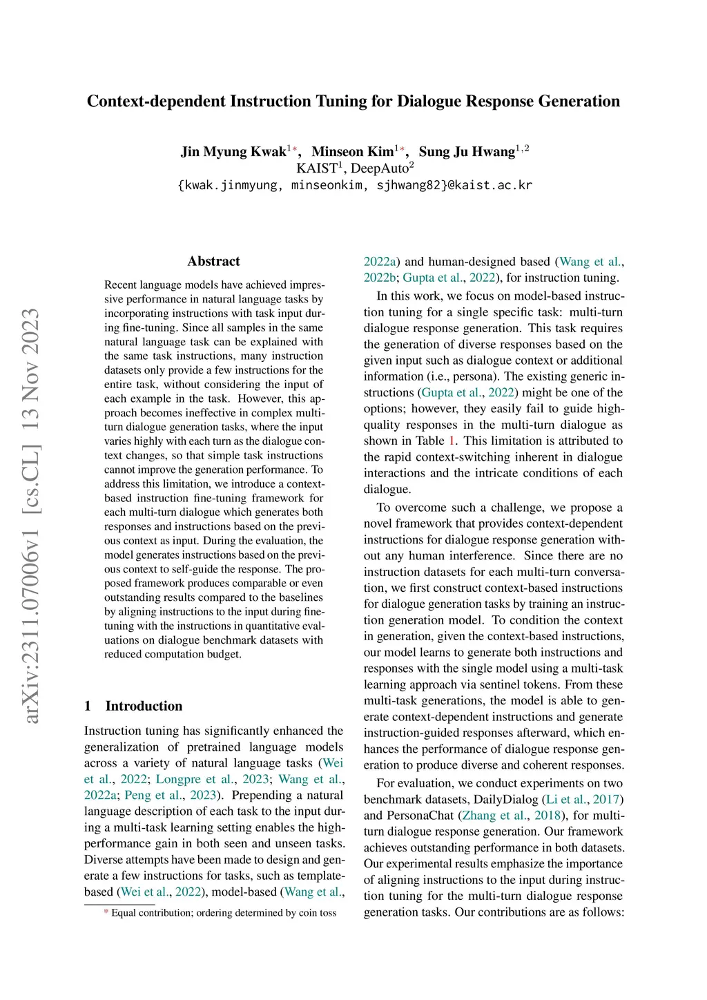 Recent language models have achieved impressive performance in natural language tasks by incorporating instructions with task input during fine-tuning. Since all samples in the same natural language task can be explained with the same task instructions, many instruction datasets only provide a few instructions for the entire task, without considering the input of each example in the task. However, this approach becomes ineffective in complex multi-turn dialogue generation tasks, where the input varies highly with each turn as the dialogue context changes, so that simple task instructions cannot improve the generation performance. To address this limitation, we introduce a context-based instruction fine-tuning framework for each multi-turn dialogue which generates both responses and instructions based on the previous context as input. During the evaluation, the model generates instructions based on the previous context to self-guide the response. The proposed framework produces comparable or even outstanding results compared to the baselines by aligning instructions to the input during fine-tuning with the instructions in quantitative evaluations on dialogue benchmark datasets with reduced computation budget.