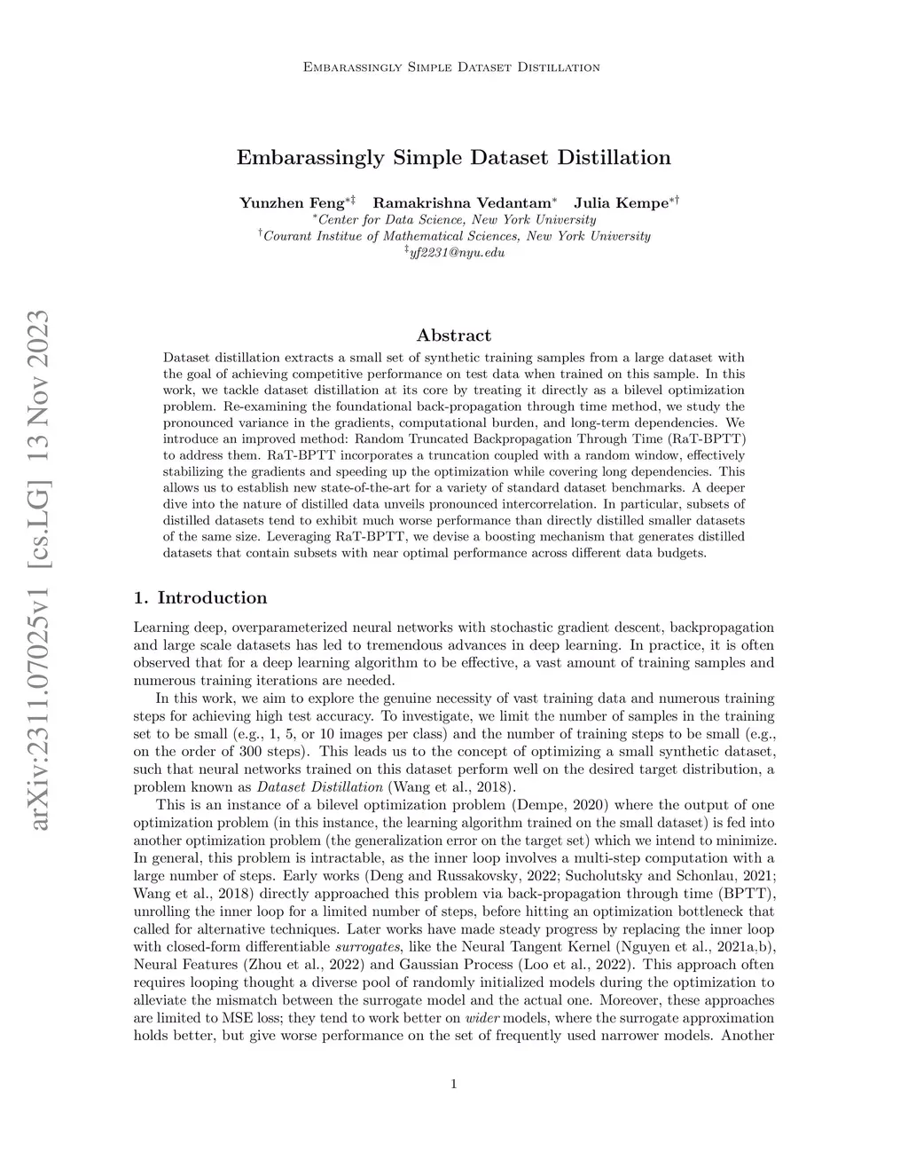 Dataset distillation extracts a small set of synthetic training samples from a large dataset with the goal of achieving competitive performance on test data when trained on this sample. In this work, we tackle dataset distillation at its core by treating it directly as a bilevel optimization problem. Re-examining the foundational back-propagation through time method, we study the pronounced variance in the gradients, computational burden, and long-term dependencies. We introduce an improved method: Random Truncated Backpropagation Through Time (RaT-BPTT) to address them. RaT-BPTT incorporates a truncation coupled with a random window, effectively stabilizing the gradients and speeding up the optimization while covering long dependencies. This allows us to establish new state-of-the-art for a variety of standard dataset benchmarks. A deeper dive into the nature of distilled data unveils pronounced intercorrelation. In particular, subsets of distilled datasets tend to exhibit much worse performance than directly distilled smaller datasets of the same size. Leveraging RaT-BPTT, we devise a boosting mechanism that generates distilled datasets that contain subsets with near optimal performance across different data budgets.
