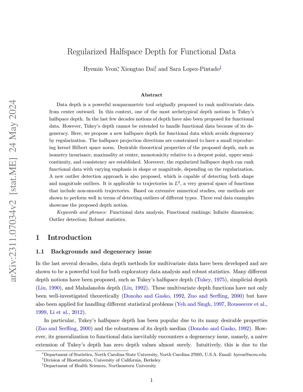 Data depth is a powerful nonparametric tool originally proposed to rank multivariate data from center outward. In this context, one of the most archetypical depth notions is Tukey's halfspace depth. In the last few decades notions of depth have also been proposed for functional data. However, Tukey's depth cannot be extended to handle functional data because of its degeneracy. Here, we propose a new halfspace depth for functional data which avoids degeneracy by regularization. The halfspace projection directions are constrained to have a small reproducing kernel Hilbert space norm. Desirable theoretical properties of the proposed depth, such as isometry invariance, maximality at center, monotonicity relative to a deepest point, upper semi-continuity, and consistency are established. Moreover, the regularized halfspace depth can rank functional data with varying emphasis in shape or magnitude, depending on the regularization. A new outlier detection approach is also proposed, which is capable of detecting both shape and magnitude outliers. It is applicable to trajectories in , a very general space of functions that include non-smooth trajectories. Based on extensive numerical studies, our methods are shown to perform well in terms of detecting outliers of different types. Three real data examples showcase the proposed depth notion.