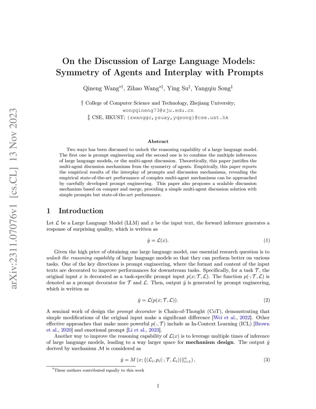 Two ways has been discussed to unlock the reasoning capability of a large language model. The first one is prompt engineering and the second one is to combine the multiple inferences of large language models, or the multi-agent discussion. Theoretically, this paper justifies the multi-agent discussion mechanisms from the symmetry of agents. Empirically, this paper reports the empirical results of the interplay of prompts and discussion mechanisms, revealing the empirical state-of-the-art performance of complex multi-agent mechanisms can be approached by carefully developed prompt engineering. This paper also proposes a scalable discussion mechanism based on conquer and merge, providing a simple multi-agent discussion solution with simple prompts but state-of-the-art performance.