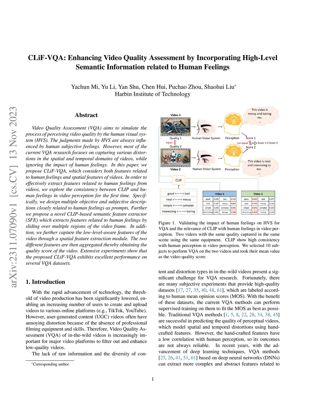 Video Quality Assessment (VQA) aims to simulate the process of perceiving video quality by the human visual system (HVS). The judgments made by HVS are always influenced by human subjective feelings. However, most of the current VQA research focuses on capturing various distortions in the spatial and temporal domains of videos, while ignoring the impact of human feelings. In this paper, we propose CLiF-VQA, which considers both features related to human feelings and spatial features of videos. In order to effectively extract features related to human feelings from videos, we explore the consistency between CLIP and human feelings in video perception for the first time. Specifically, we design multiple objective and subjective descriptions closely related to human feelings as prompts. Further we propose a novel CLIP-based semantic feature extractor (SFE) which extracts features related to human feelings by sliding over multiple regions of the video frame. In addition, we further capture the low-level-aware features of the video through a spatial feature extraction module. The two different features are then aggregated thereby obtaining the quality score of the video. Extensive experiments show that the proposed CLiF-VQA exhibits excellent performance on several VQA datasets.