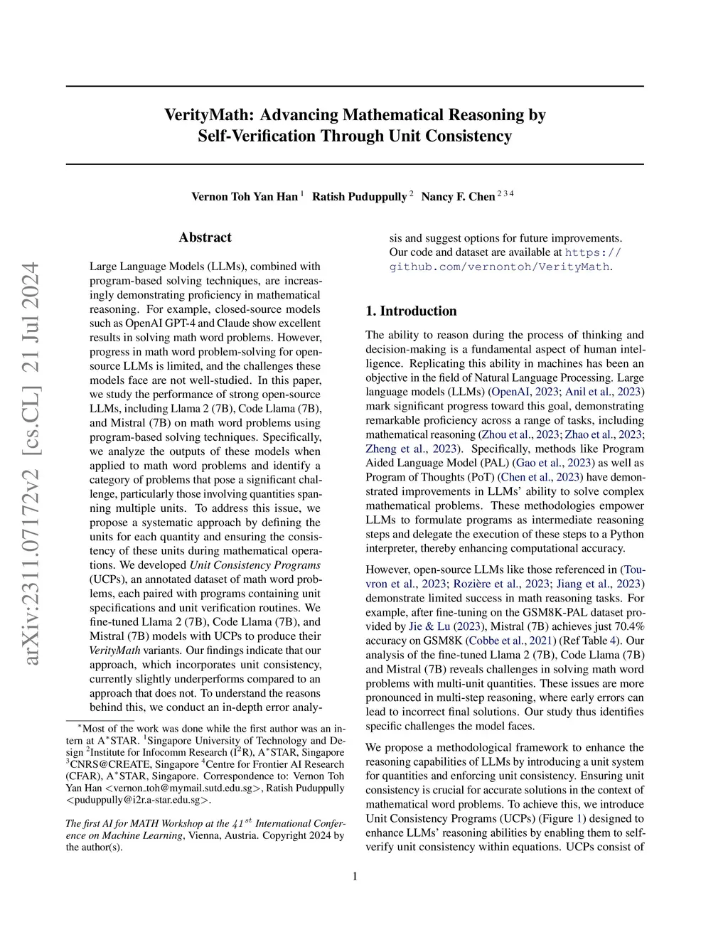 Large Language Models (LLMs) combined with program-based solving techniques are increasingly demonstrating proficiency in mathematical reasoning. However, such progress is mostly demonstrated in closed-source models such as OpenAI-GPT4 and Claude. In this paper, we seek to study the performance of strong open-source LLMs. Specifically, we analyze the outputs of Code Llama (7B) when applied to math word problems. We identify a category of problems that pose a challenge for the model, particularly those involving quantities that span multiple types or units. To address this issue, we propose a systematic approach by defining units for each quantity and ensuring the consistency of these units during mathematical operations. We developed Unit Consistency Programs (UCPs), an annotated dataset of math word problems, each paired with programs that contain unit specifications and unit verification routines. Finally, we finetune the Code Llama (7B) model with UCPs to produce VerityMath and present our preliminary findings.