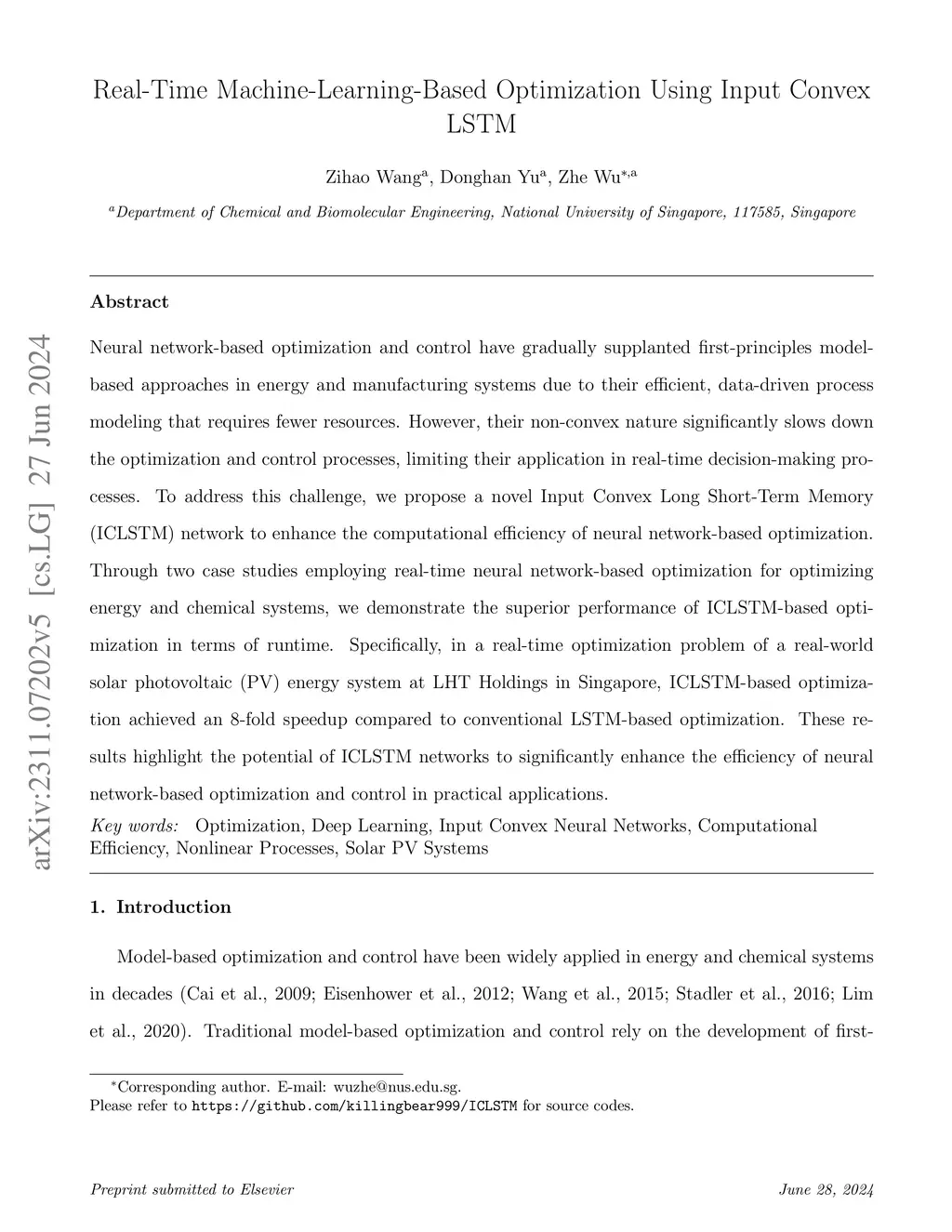 Neural network-based optimization and control have gradually supplanted first-principles model-based approaches in energy and manufacturing systems due to their efficient, data-driven process modeling that requires fewer resources. However, their non-convex nature significantly slows down the optimization and control processes, limiting their application in real-time decision-making processes. To address this challenge, we propose a novel Input Convex Long Short-Term Memory (ICLSTM) network to enhance the computational efficiency of neural network-based optimization. Through two case studies employing real-time neural network-based optimization for optimizing energy and chemical systems, we demonstrate the superior performance of ICLSTM-based optimization in terms of runtime. Specifically, in a real-time optimization problem of a real-world solar photovoltaic (PV) energy system at LHT Holdings in Singapore, ICLSTM-based optimization achieved an 8-fold speedup compared to conventional LSTM-based optimization. These results highlight the potential of ICLSTM networks to significantly enhance the efficiency of neural network-based optimization and control in practical applications. Source code is available at https://github.com/killingbear999/ICLSTM.