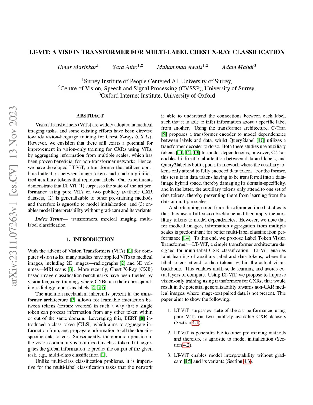 LT-ViT: A Vision Transformer for multi-label Chest X-ray classification