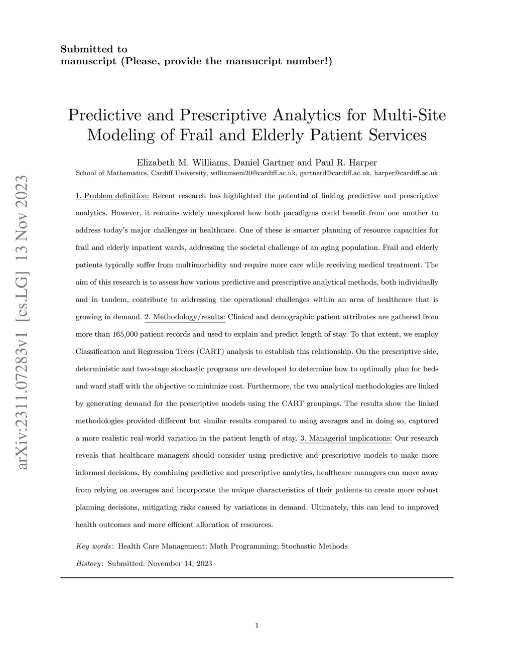 Predictive and prescriptive analytics for multi-site modelling of frail and elderly patient services