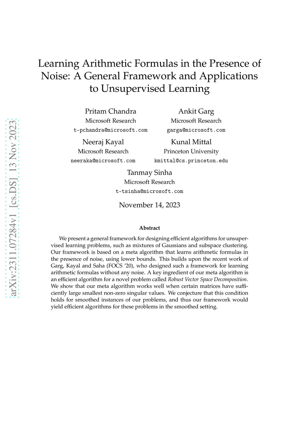 We present a general framework for designing efficient algorithms for unsupervised learning problems, such as mixtures of Gaussians and subspace clustering. Our framework is based on a meta algorithm that learns arithmetic circuits in the presence of noise, using lower bounds. This builds upon the recent work of Garg, Kayal and Saha (FOCS 20), who designed such a framework for learning arithmetic circuits without any noise. A key ingredient of our meta algorithm is an efficient algorithm for a novel problem called Robust Vector Space Decomposition. We show that our meta algorithm works well when certain matrices have sufficiently large smallest non-zero singular values. We conjecture that this condition holds for smoothed instances of our problems, and thus our framework would yield efficient algorithms for these problems in the smoothed setting.