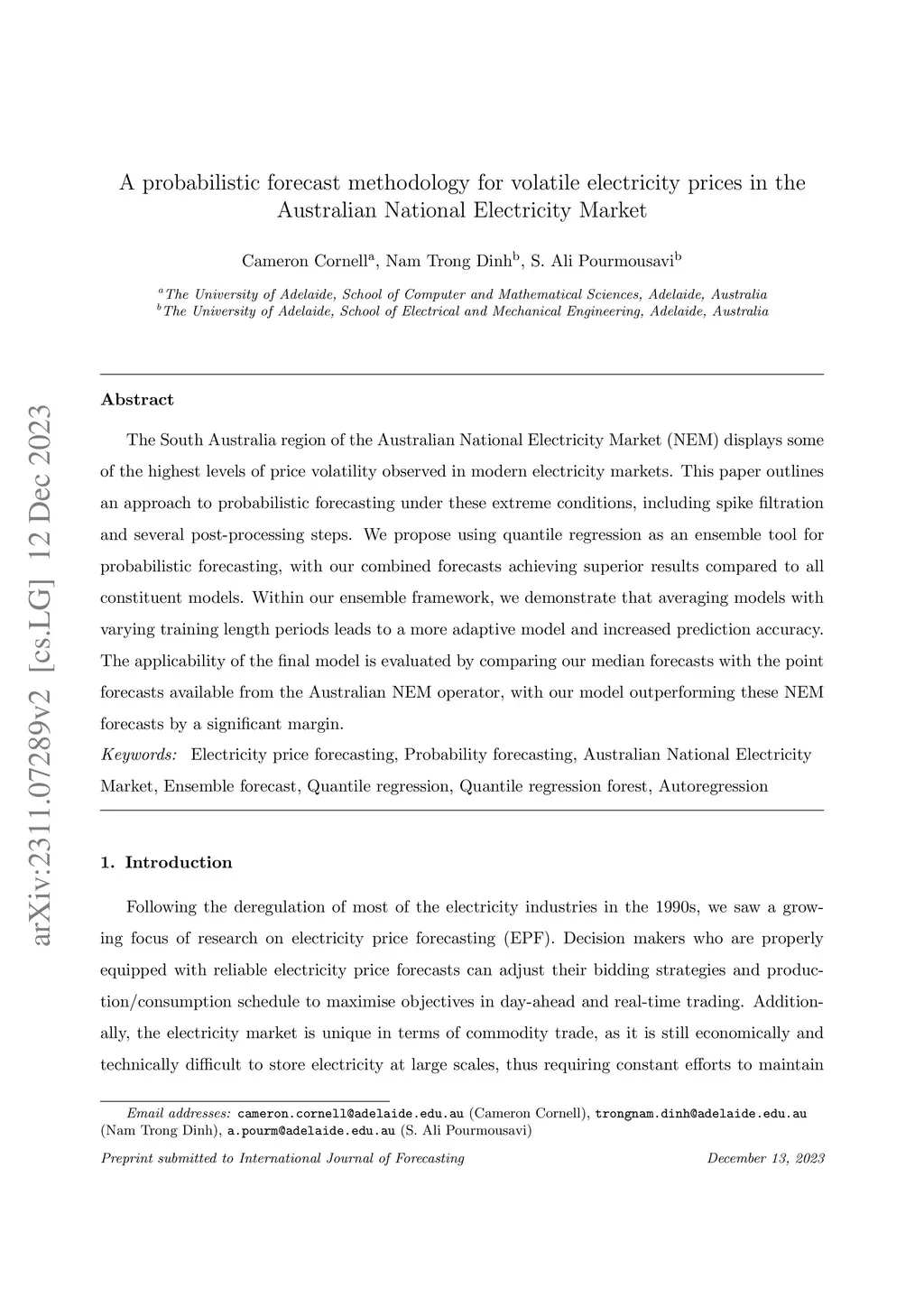 The South Australia region of the Australian National Electricity Market (NEM) displays some of the highest levels of price volatility observed in modern electricity markets. This paper outlines an approach to probabilistic forecasting under these extreme conditions, including spike filtration and several post-processing steps. We propose using quantile regression as an ensemble tool for probabilistic forecasting, with our combined forecasts achieving superior results compared to all constituent models. Within our ensemble framework, we demonstrate that averaging models with varying training length periods leads to a more adaptive model and increased prediction accuracy. The applicability of the final model is evaluated by comparing our median forecasts with the point forecasts available from the Australian NEM operator, with our model outperforming these NEM forecasts by a significant margin.