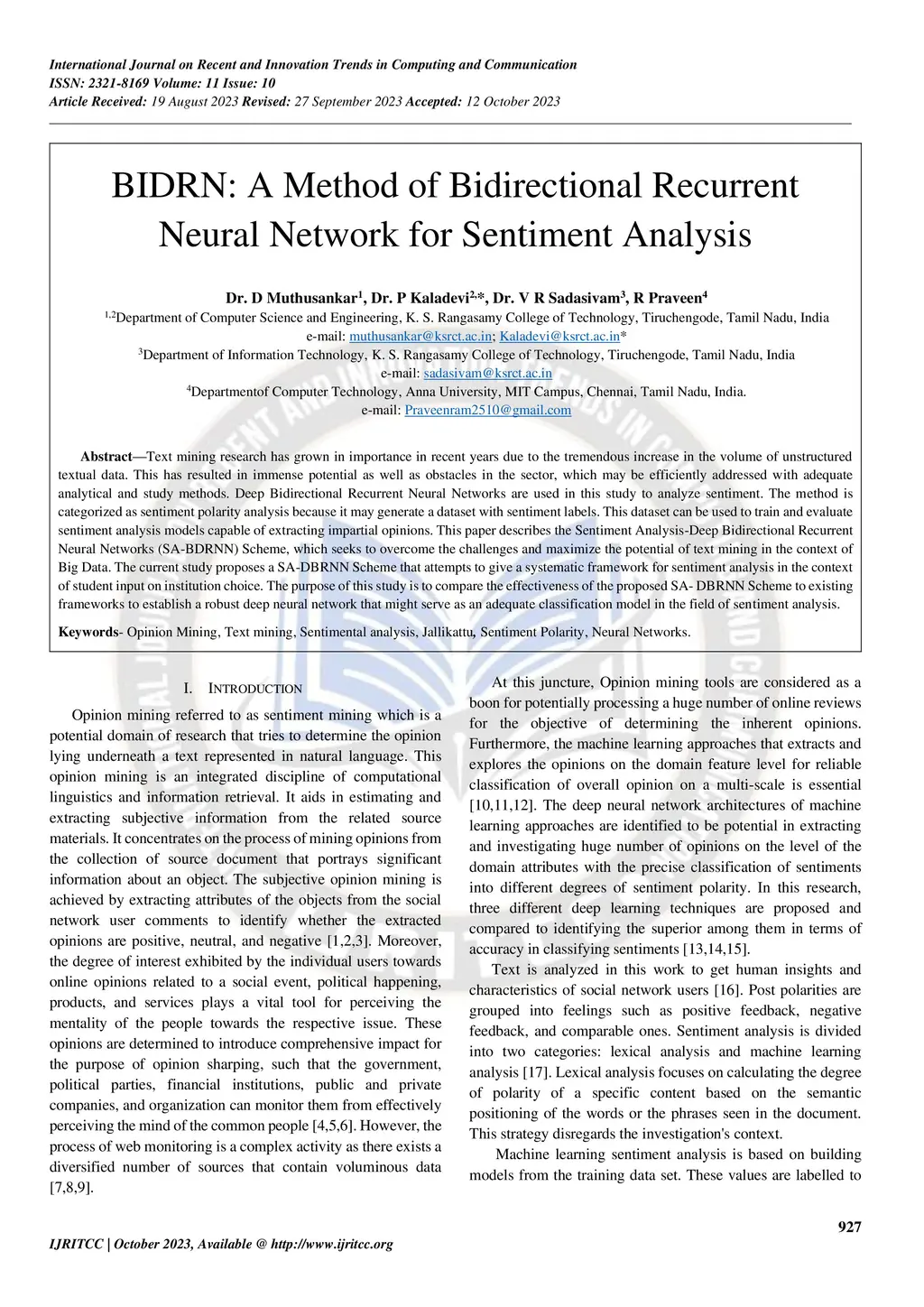Text mining research has grown in importance in recent years due to the tremendous increase in the volume of unstructured textual data. This has resulted in immense potential as well as obstacles in the sector, which may be efficiently addressed with adequate analytical and study methods. Deep Bidirectional Recurrent Neural Networks are used in this study to analyze sentiment. The method is categorized as sentiment polarity analysis because it may generate a dataset with sentiment labels. This dataset can be used to train and evaluate sentiment analysis models capable of extracting impartial opinions. This paper describes the Sentiment Analysis-Deep Bidirectional Recurrent Neural Networks (SA-BDRNN) Scheme, which seeks to overcome the challenges and maximize the potential of text mining in the context of Big Data. The current study proposes a SA-DBRNN Scheme that attempts to give a systematic framework for sentiment analysis in the context of student input on institution choice. The purpose of this study is to compare the effectiveness of the proposed SA- DBRNN Scheme to existing frameworks to establish a robust deep neural network that might serve as an adequate classification model in the field of sentiment analysis.