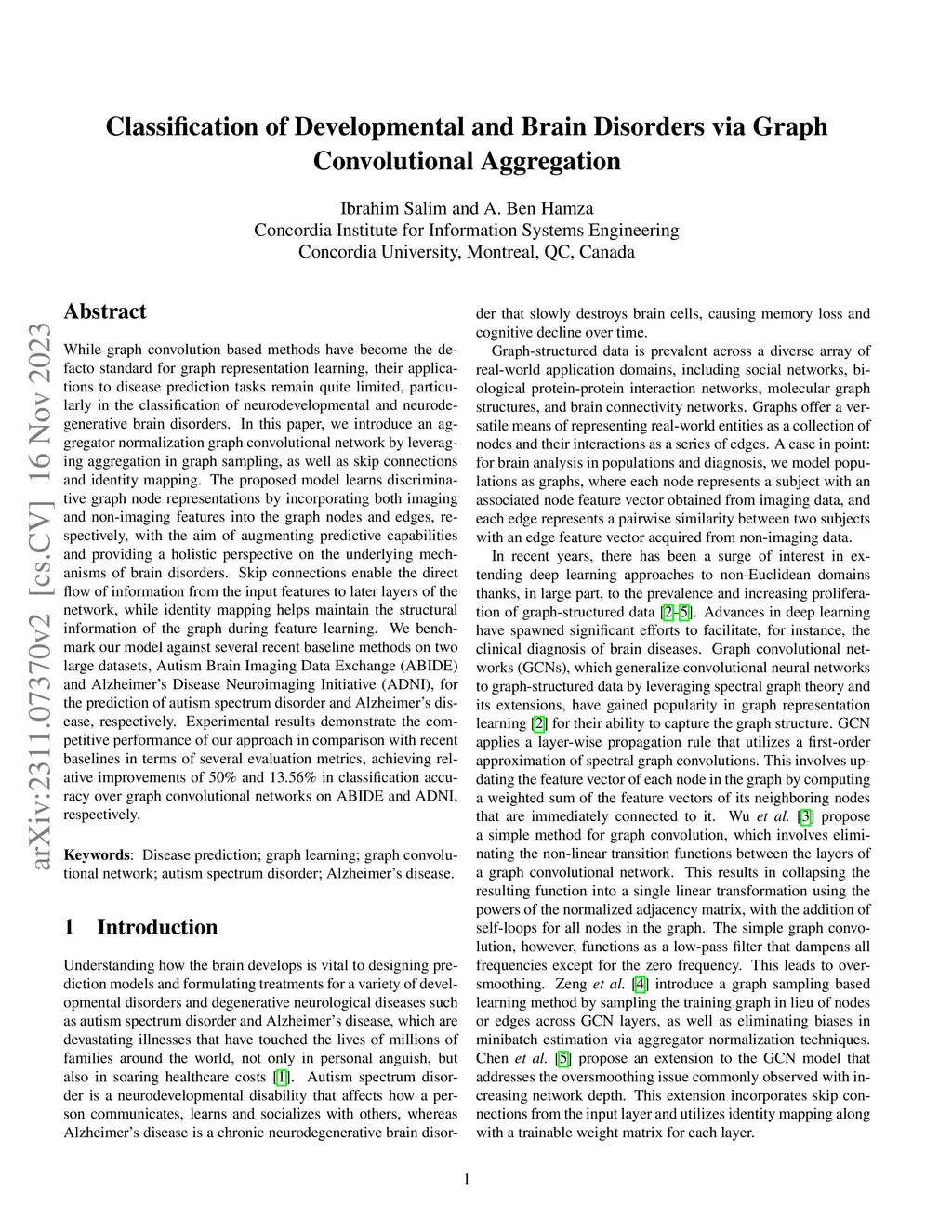 While graph convolution based methods have become the de-facto standard for graph representation learning, their applications to disease prediction tasks remain quite limited, particularly in the classification of neurodevelopmental and neurodegenerative brain disorders. In this paper, we introduce an aggregator normalization graph convolutional network by leveraging aggregation in graph sampling, as well as skip connections and identity mapping. The proposed model learns discriminative graph node representations by incorporating both imaging and non-imaging features into the graph nodes and edges, respectively, with the aim of augmenting predictive capabilities and providing a holistic perspective on the underlying mechanisms of brain disorders. Skip connections enable the direct flow of information from the input features to later layers of the network, while identity mapping helps maintain the structural information of the graph during feature learning. We benchmark our model against several recent baseline methods on two large datasets, Autism Brain Imaging Data Exchange (ABIDE) and Alzheimer's Disease Neuroimaging Initiative (ADNI), for the prediction of autism spectrum disorder and Alzheimer's disease, respectively. Experimental results demonstrate the competitive performance of our approach in comparison with recent baselines in terms of several evaluation metrics, achieving relative improvements of 50% and 13.56% in classification accuracy over graph convolutional networks on ABIDE and ADNI, respectively.