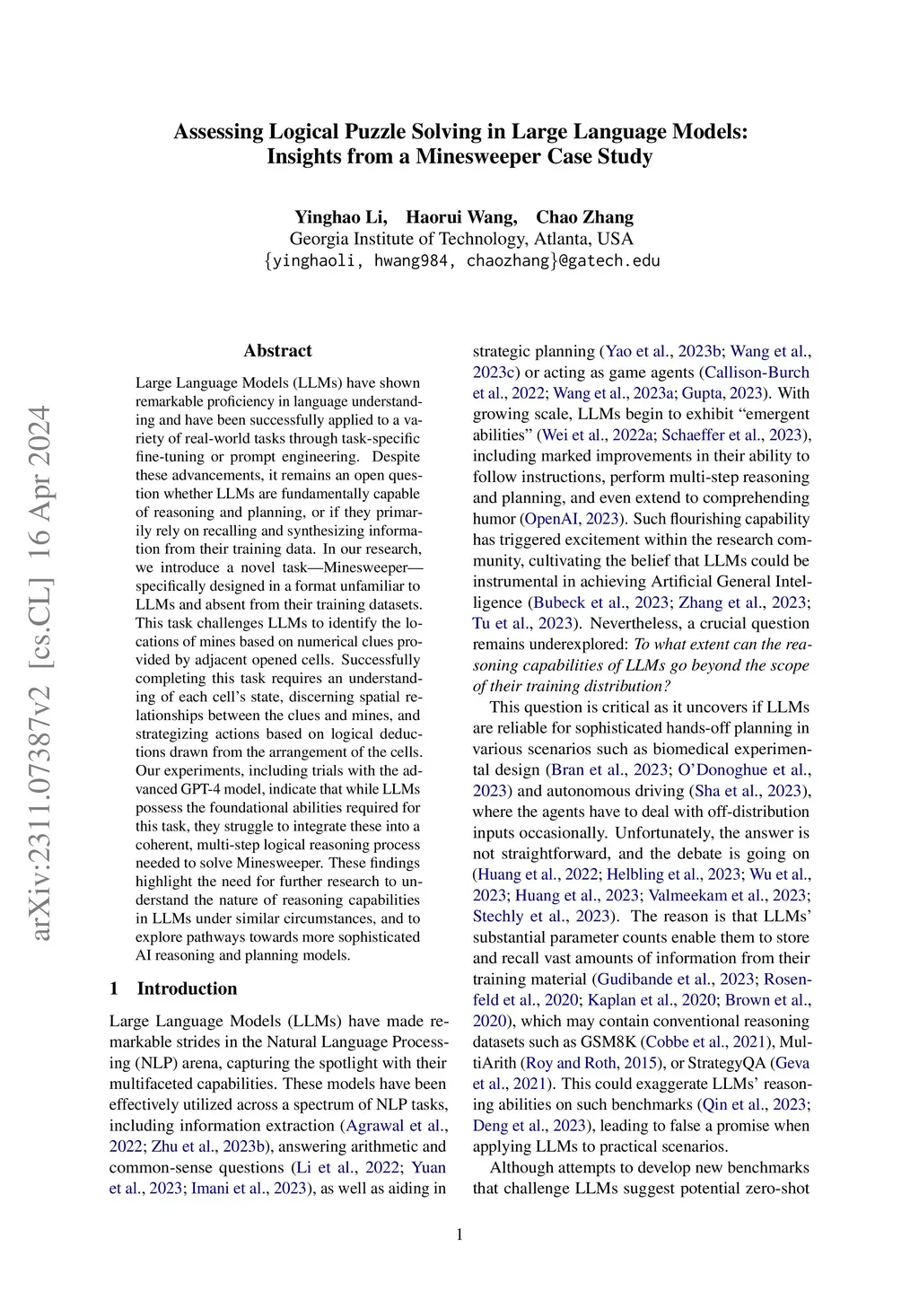 Large Language Models (LLMs) have shown remarkable proficiency in language understanding and have been successfully applied to a variety of real-world tasks through task-specific fine-tuning or prompt engineering. Despite these advancements, it remains an open question whether LLMs are fundamentally capable of reasoning and planning, or if they primarily rely on recalling and synthesizing information from their training data. In our research, we introduce a novel task -- Minesweeper -- specifically designed in a format unfamiliar to LLMs and absent from their training datasets. This task challenges LLMs to identify the locations of mines based on numerical clues provided by adjacent opened cells. Successfully completing this task requires an understanding of each cell's state, discerning spatial relationships between the clues and mines, and strategizing actions based on logical deductions drawn from the arrangement of the cells. Our experiments, including trials with the advanced GPT-4 model, indicate that while LLMs possess the foundational abilities required for this task, they struggle to integrate these into a coherent, multi-step logical reasoning process needed to solve Minesweeper. These findings highlight the need for further research to understand the nature of reasoning capabilities in LLMs under similar circumstances, and to explore pathways towards more sophisticated AI reasoning and planning models.