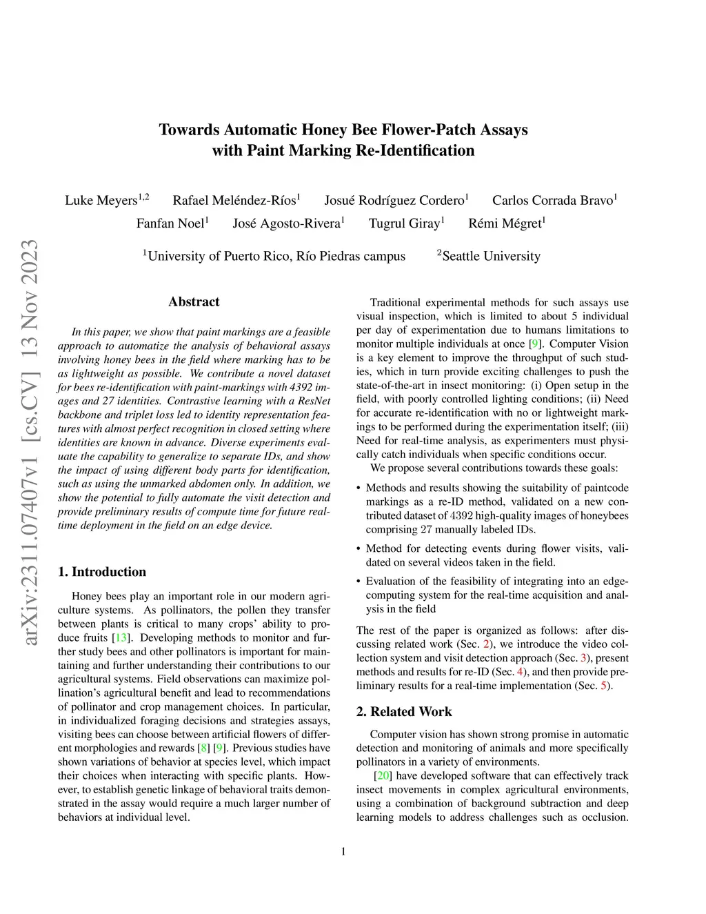 In this paper, we show that paint markings are a feasible approach to automatize the analysis of behavioral assays involving honey bees in the field where marking has to be as lightweight as possible. We contribute a novel dataset for bees re-identification with paint-markings with 4392 images and 27 identities. Contrastive learning with a ResNet backbone and triplet loss led to identity representation features with almost perfect recognition in closed setting where identities are known in advance. Diverse experiments evaluate the capability to generalize to separate IDs, and show the impact of using different body parts for identification, such as using the unmarked abdomen only. In addition, we show the potential to fully automate the visit detection and provide preliminary results of compute time for future real-time deployment in the field on an edge device.