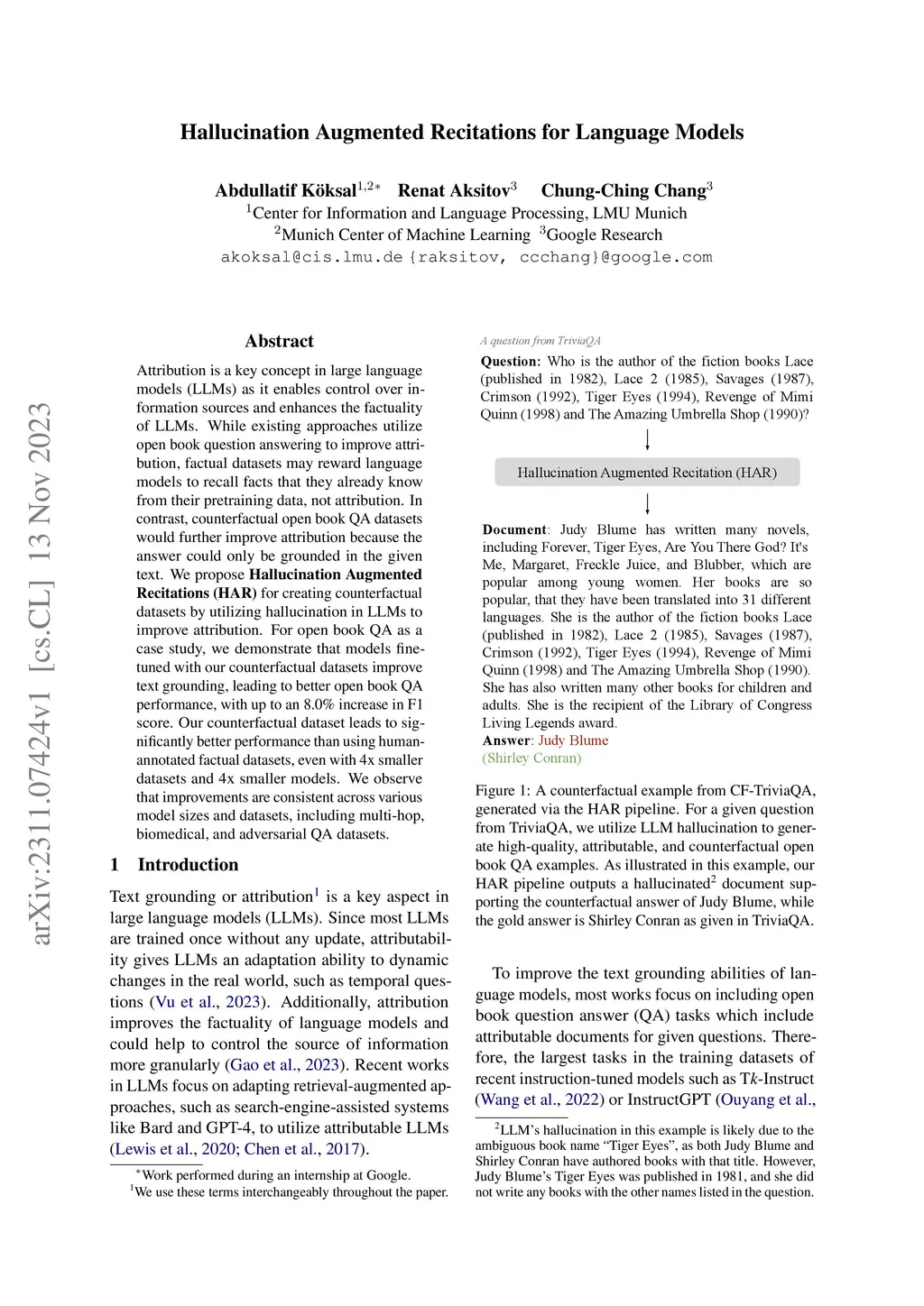 Attribution is a key concept in large language models (LLMs) as it enables control over information sources and enhances the factuality of LLMs. While existing approaches utilize open book question answering to improve attribution, factual datasets may reward language models to recall facts that they already know from their pretraining data, not attribution. In contrast, counterfactual open book QA datasets would further improve attribution because the answer could only be grounded in the given text. We propose Hallucination Augmented Recitations (HAR) for creating counterfactual datasets by utilizing hallucination in LLMs to improve attribution. For open book QA as a case study, we demonstrate that models finetuned with our counterfactual datasets improve text grounding, leading to better open book QA performance, with up to an 8.0% increase in F1 score. Our counterfactual dataset leads to significantly better performance than using humanannotated factual datasets, even with 4x smaller datasets and 4x smaller models. We observe that improvements are consistent across various model sizes and datasets, including multi-hop, biomedical, and adversarial QA datasets.