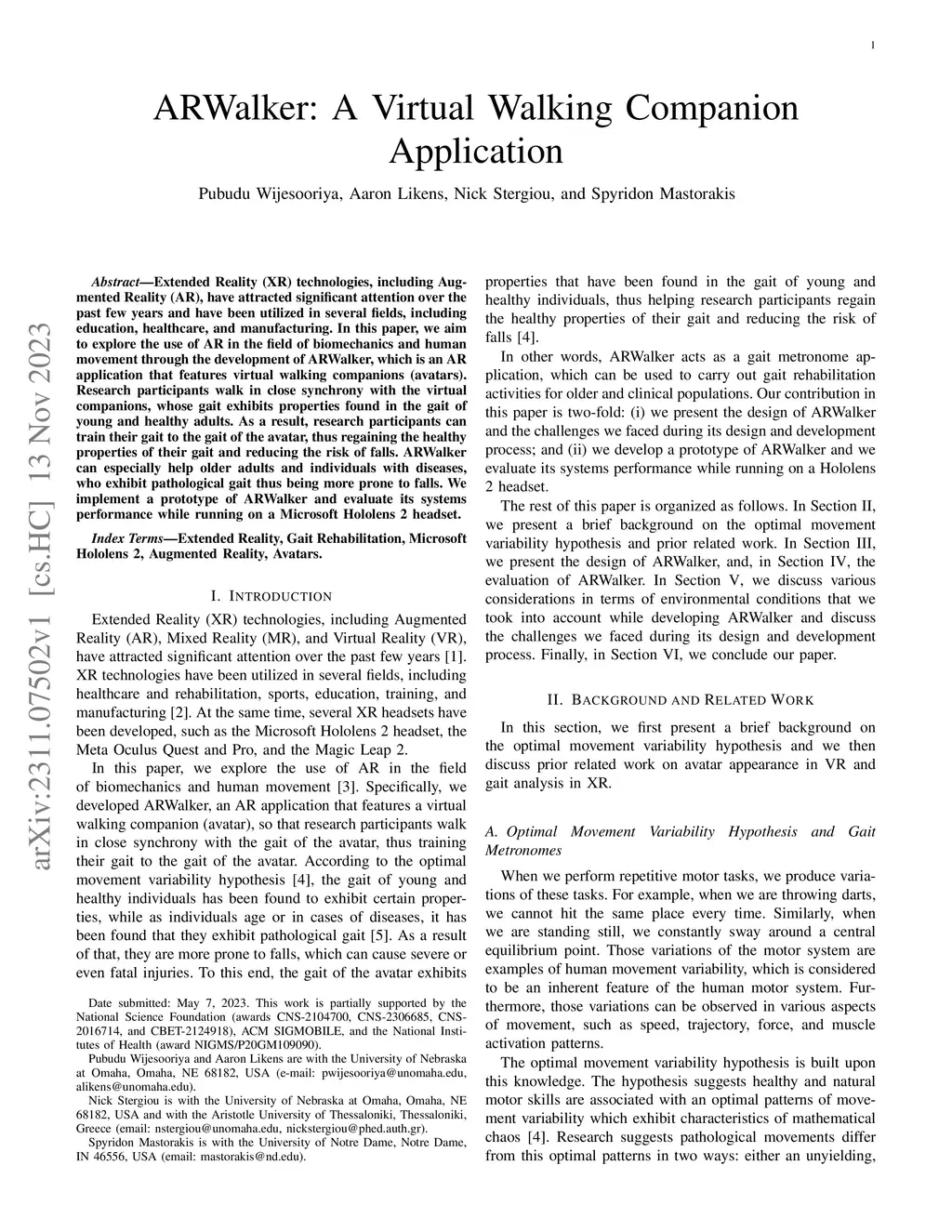 Extended Reality (XR) technologies, including Augmented Reality (AR), have attracted significant attention over the past few years and have been utilized in several fields, including education, healthcare, and manufacturing. In this paper, we aim to explore the use of AR in the field of biomechanics and human movement through the development of ARWalker, which is an AR application that features virtual walking companions (avatars). Research participants walk in close synchrony with the virtual companions, whose gait exhibits properties found in the gait of young and healthy adults. As a result, research participants can train their gait to the gait of the avatar, thus regaining the healthy properties of their gait and reducing the risk of falls. ARWalker can especially help older adults and individuals with diseases, who exhibit pathological gait thus being more prone to falls. We implement a prototype of ARWalker and evaluate its systems performance while running on a Microsoft Hololens 2 headset.