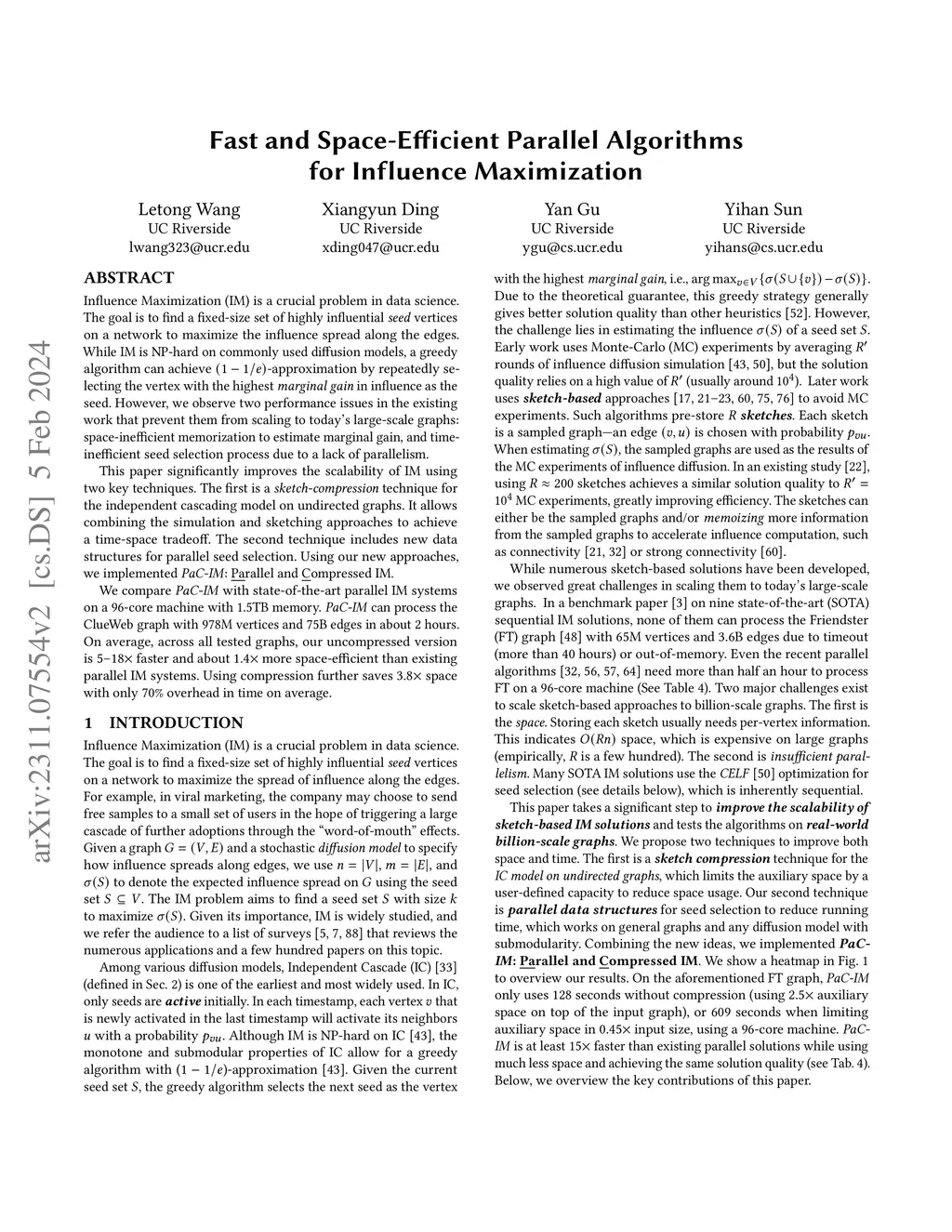 Influence Maximization (IM) is a crucial problem in data science. The goal is to find a fixed-size set of highly-influential seed vertices on a network to maximize the influence spread along the edges. While IM is NP-hard on commonly-used diffusion models, a greedy algorithm can achieve -approximation, repeatedly selecting the vertex with the highest marginal gain in influence as the seed. Due to theoretical guarantees, rich literature focuses on improving the performance of the greedy algorithm. To estimate the marginal gain, existing work either runs Monte Carlo (MC) simulations of influence spread or pre-stores hundreds of sketches (usually per-vertex information). However, these approaches can be inefficient in time (MC simulation) or space (storing sketches), preventing the ideas from scaling to today's large-scale graphs. This paper significantly improves the scalability of IM using two key techniques. The first is a sketch-compression technique for the independent cascading model on undirected graphs. It allows combining the simulation and sketching approaches to achieve a time-space tradeoff. The second technique includes new data structures for parallel seed selection. Using our new approaches, we implemented PaC-IM: Parallel and Compressed IM. We compare PaC-IM with state-of-the-art parallel IM systems on a 96-core machine with 1.5TB memory. PaC-IM can process large-scale graphs with up to 900M vertices and 74B edges in about 2 hours. On average across all tested graphs, our uncompressed version is 5--18 faster and about 1.4 more space-efficient than existing parallel IM systems. Using compression further saves 3.8 space with only 70% overhead in time on average.