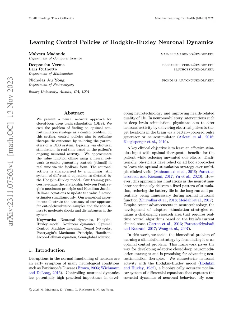 Learning Control Policies of Hodgkin-Huxley Neuronal Dynamics
