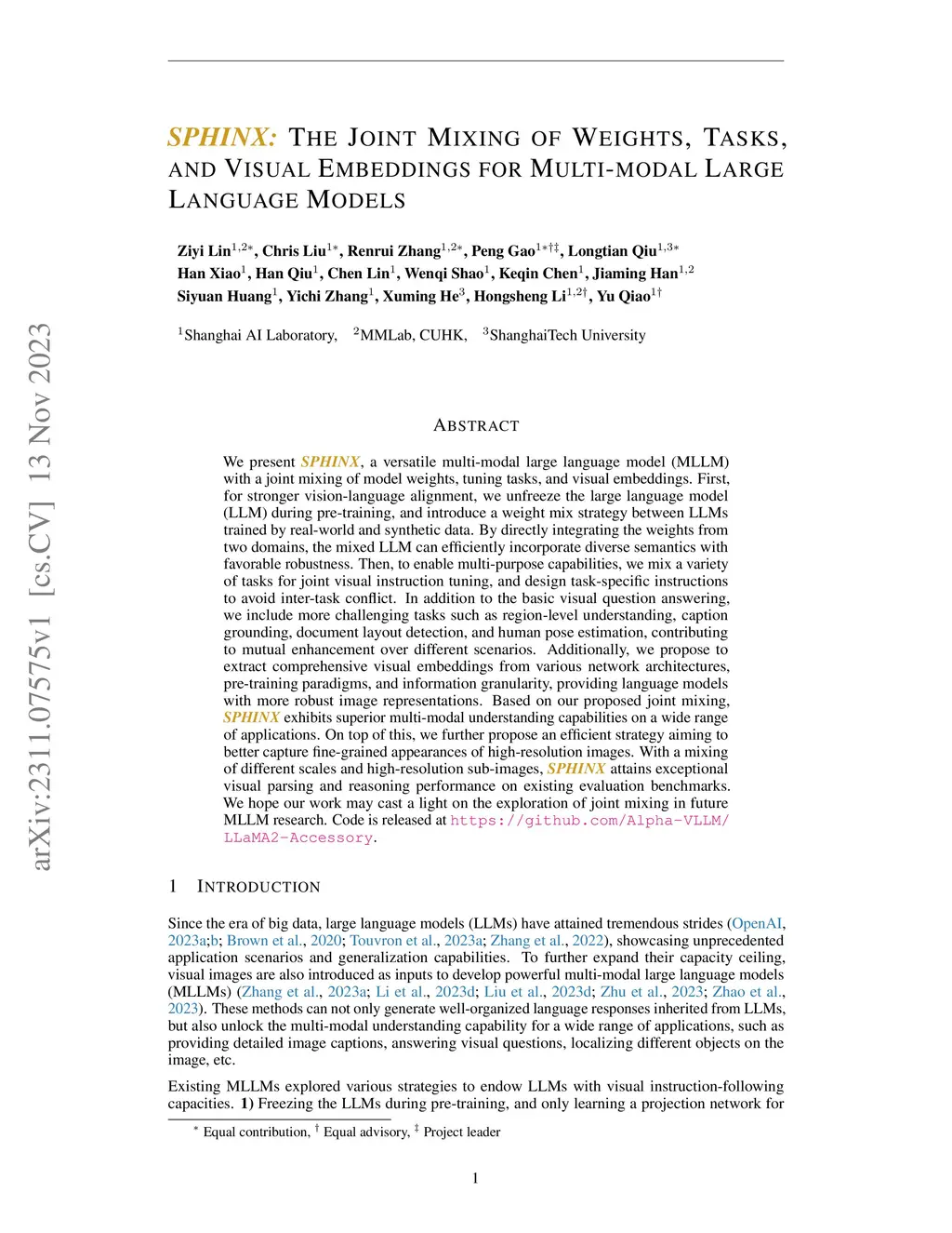 SPHINX: The Joint Mixing of Weights, Tasks, and Visual Embeddings for