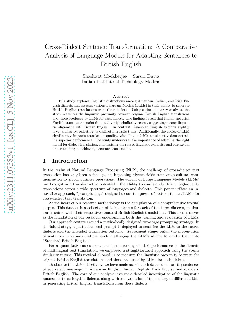 This study explores linguistic distinctions among American, Indian, and Irish English dialects and assesses various Language Models (LLMs) in their ability to generate British English translations from these dialects. Using cosine similarity analysis, the study measures the linguistic proximity between original British English translations and those produced by LLMs for each dialect. The findings reveal that Indian and Irish English translations maintain notably high similarity scores, suggesting strong linguistic alignment with British English. In contrast, American English exhibits slightly lower similarity, reflecting its distinct linguistic traits. Additionally, the choice of LLM significantly impacts translation quality, with Llama-2-70b consistently demonstrating superior performance. The study underscores the importance of selecting the right model for dialect translation, emphasizing the role of linguistic expertise and contextual understanding in achieving accurate translations.