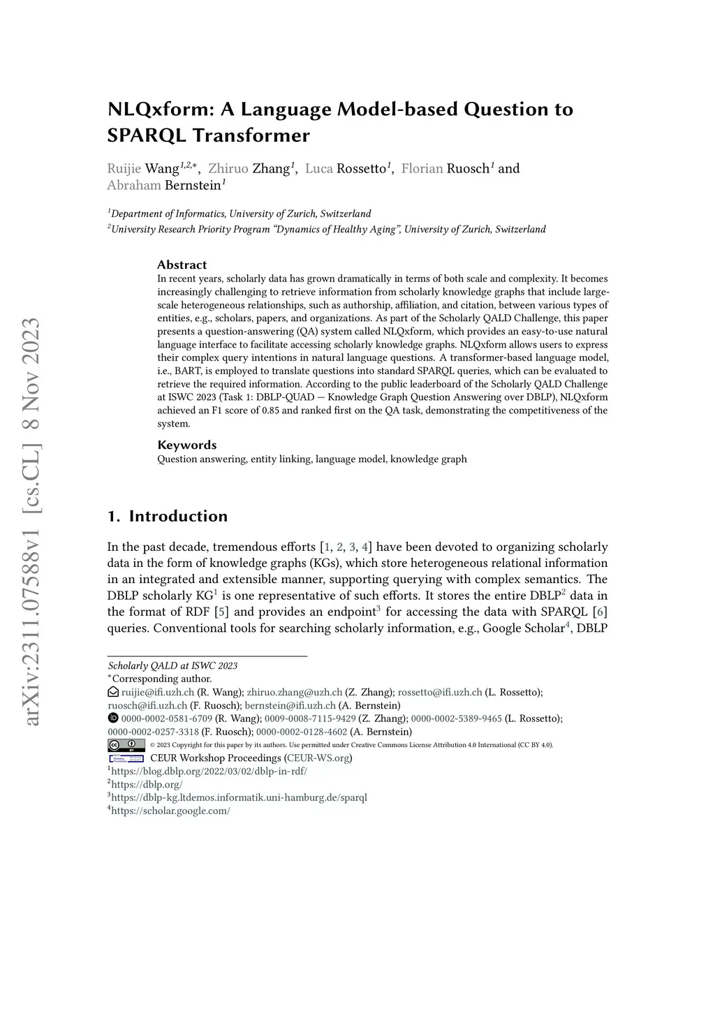 In recent years, scholarly data has grown dramatically in terms of both scale and complexity. It becomes increasingly challenging to retrieve information from scholarly knowledge graphs that include large-scale heterogeneous relationships, such as authorship, affiliation, and citation, between various types of entities, e.g., scholars, papers, and organizations. As part of the Scholarly QALD Challenge, this paper presents a question-answering (QA) system called NLQxform, which provides an easy-to-use natural language interface to facilitate accessing scholarly knowledge graphs. NLQxform allows users to express their complex query intentions in natural language questions. A transformer-based language model, i.e., BART, is employed to translate questions into standard SPARQL queries, which can be evaluated to retrieve the required information. According to the public leaderboard of the Scholarly QALD Challenge at ISWC 2023 (Task 1: DBLP-QUAD - Knowledge Graph Question Answering over DBLP), NLQxform achieved an F1 score of 0.85 and ranked first on the QA task, demonstrating the competitiveness of the system.