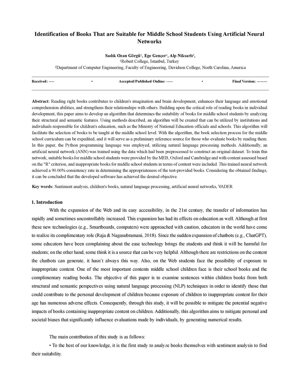 Reading right books contributes to children's imagination and brain development, enhances their language and emotional comprehension abilities, and strengthens their relationships with others. Building upon the critical role of reading books in individual development, this paper aims to develop an algorithm that determines the suitability of books for middle school students by analyzing their structural and semantic features. Using methods described, an algorithm will be created that can be utilized by institutions and individuals responsible for children's education, such as the Ministry of National Education officials and schools. This algorithm will facilitate the selection of books to be taught at the middle school level. With the algorithm, the book selection process for the middle school curriculum can be expedited, and it will serve as a preliminary reference source for those who evaluate books by reading them. In this paper, the Python programming language was employed, utilizing natural language processing methods. Additionally, an artificial neural network (ANN) was trained using the data which had been preprocessed to construct an original dataset. To train this network, suitable books for middle school students were provided by the MEB, Oxford and Cambridge and with content assessed based on the "R" criterion, and inappropriate books for middle school students in terms of content were included. This trained neural network achieved a 90.06% consistency rate in determining the appropriateness of the test-provided books. Considering the obtained findings, it can be concluded that the developed software has achieved the desired objective.