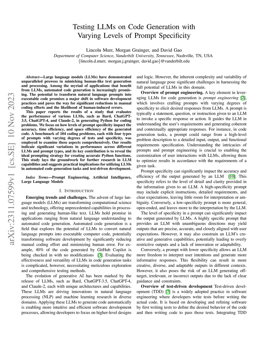 Large language models (LLMs) have demonstrated unparalleled prowess in mimicking human-like text generation and processing. Among the myriad of applications that benefit from LLMs, automated code generation is increasingly promising. The potential to transform natural language prompts into executable code promises a major shift in software development practices and paves the way for significant reductions in manual coding efforts and the likelihood of human-induced errors. This paper reports the results of a study that evaluates the performance of various LLMs, such as Bard, ChatGPT-3.5, ChatGPT-4, and Claude-2, in generating Python for coding problems. We focus on how levels of prompt specificity impact the accuracy, time efficiency, and space efficiency of the generated code. A benchmark of 104 coding problems, each with four types of prompts with varying degrees of tests and specificity, was employed to examine these aspects comprehensively. Our results indicate significant variations in performance across different LLMs and prompt types, and its key contribution is to reveal the ideal prompting strategy for creating accurate Python functions. This study lays the groundwork for further research in LLM capabilities and suggests practical implications for utilizing LLMs in automated code generation tasks and test-driven development.