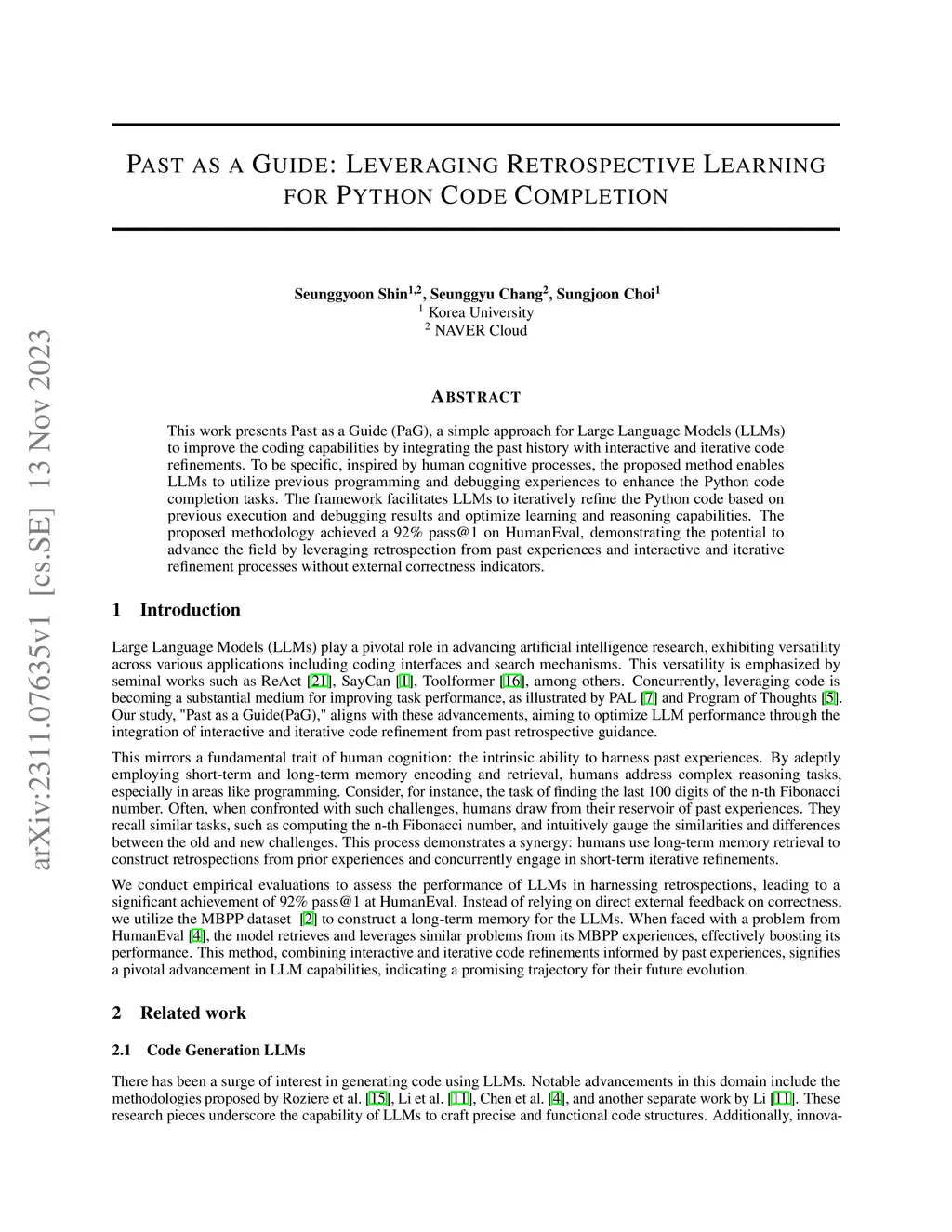 This work presents Past as a Guide (PaG), a simple approach for Large Language Models (LLMs) to improve the coding capabilities by integrating the past history with interactive and iterative code refinements. To be specific, inspired by human cognitive processes, the proposed method enables LLMs to utilize previous programming and debugging experiences to enhance the Python code completion tasks. The framework facilitates LLMs to iteratively refine the Python code based on previous execution and debugging results and optimize learning and reasoning capabilities. The proposed methodology achieved a 92\% pass@1 on HumanEval, demonstrating the potential to advance the field by leveraging retrospection from past experiences and interactive and iterative refinement processes without external correctness indicators.