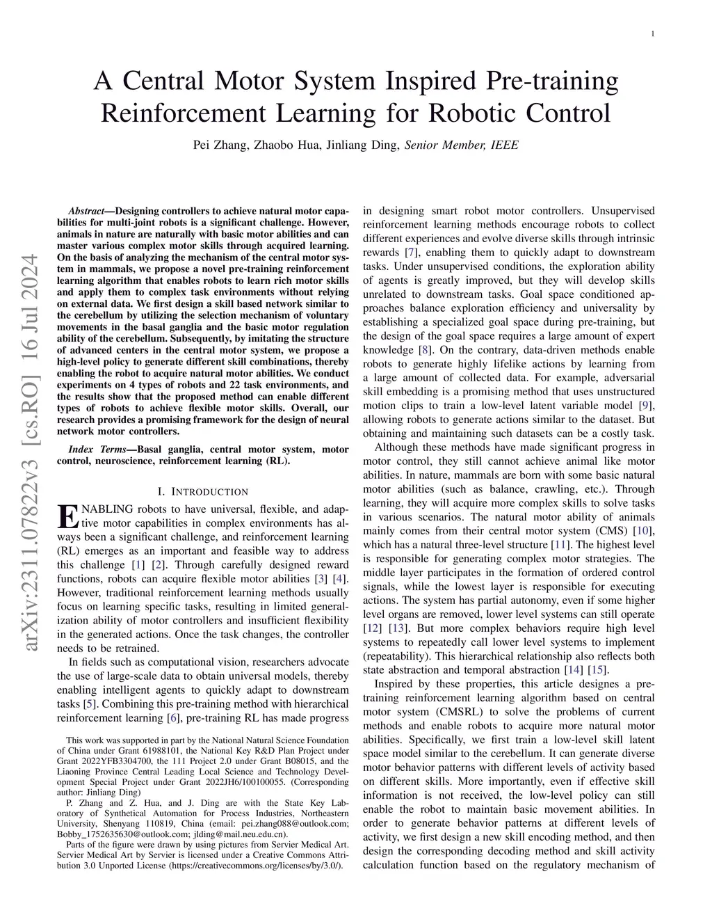 Designing controllers to achieve natural motor capabilities for multi-joint robots is a significant challenge. However, animals in nature are naturally with basic motor abilities and can master various complex motor skills through acquired learning. On the basis of analyzing the mechanism of the central motor system in mammals, we propose a novel pre-training reinforcement learning algorithm that enables robots to learn rich motor skills and apply them to complex task environments without relying on external data. We first design a skill based network similar to the cerebellum by utilizing the selection mechanism of voluntary movements in the basal ganglia and the basic motor regulation ability of the cerebellum. Subsequently, by imitating the structure of advanced centers in the central motor system, we propose a high-level policy to generate different skill combinations, thereby enabling the robot to acquire natural motor abilities. We conduct experiments on 4 types of robots and 22 task environments, and the results show that the proposed method can enable different types of robots to achieve flexible motor skills. Overall, our research provides a promising framework for the design of neural network motor controllers.