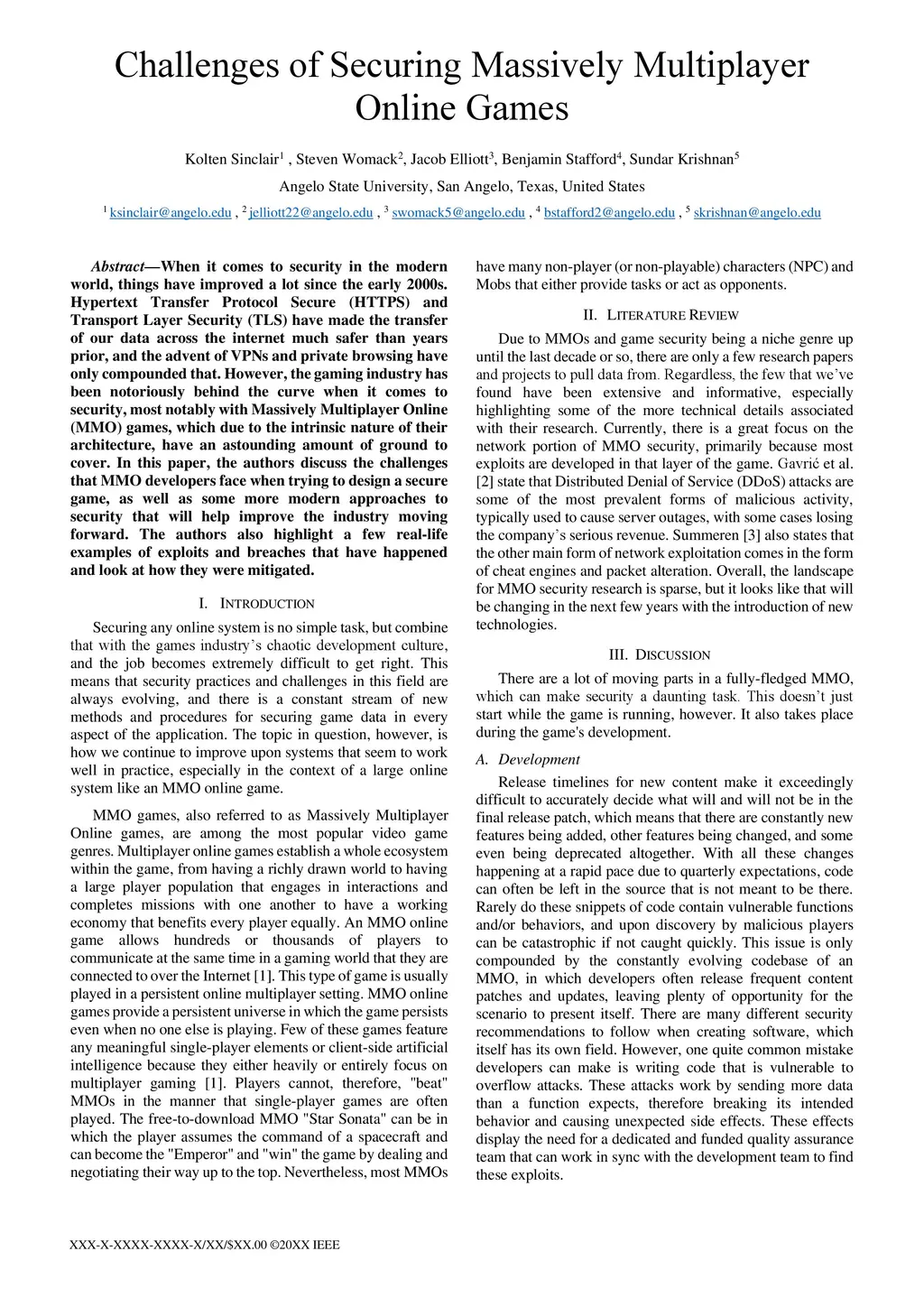 When it comes to security in the modern world, things have improved a lot since the early 2000s. Hypertext Transfer Protocol Secure (HTTPS) and Transport Layer Security (TLS) have made the transfer of our data across the internet much safer than years prior, and the advent of VPNs and private browsing have only compounded that. However, the gaming industry has been notoriously behind the curve when it comes to security, most notably with Massively Multiplayer Online (MMO) games, which due to the intrinsic nature of their architecture, have an astounding amount of ground to cover. In this paper, the authors discuss the challenges that MMO developers face when trying to design a secure game, as well as some more modern approaches to security that will help improve the industry moving forward. The authors also highlight a few real-life examples of exploits and breaches that have happened and look at how they were mitigated.